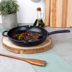 Questa padella rotonda in ghisa smaltata da 26 cm è ideale per friggere, saltare, arrostire e gratinare. La ghisa massiccia si riscalda uniformemente e mantiene una temperatura elevata a lungo, permettendo una cottura perfetta di carne, verdure e patate. Lo smalto esterno blu granato dona un aspetto elegante e facilita la manutenzione.