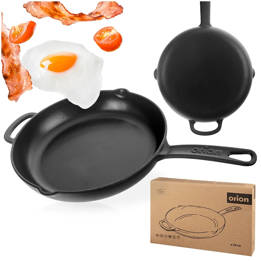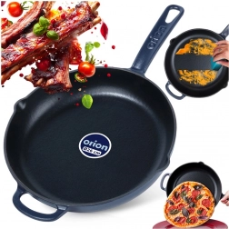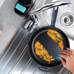 La padella è compatibile con piani cottura a gas, elettrici, in vetroceramica, alogeni e a induzione, e può essere utilizzata anche in forno, sulla fiamma diretta o sul barbecue. Il manico lungo con foro per appenderla e la maniglia ausiliaria semplificano la manipolazione. I doppi beccucci consentono di versare salse o grassi comodamente senza gocciolare.