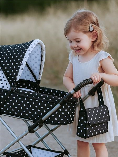 Elegante passeggino retrò per bambole NEW BABY Natálka in design a pois bianco‑nero che conquisterà tutte le piccole premurose. La struttura in metallo stabile con sospensioni e le ruote in gomma leggere assicurano una guida fluida e confortevole sia in casa che fuori. Il maniglione regolabile in 5 posizioni cresce con il bambino e la capottina pieghevole protegge la bambola dal sole.