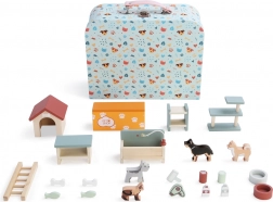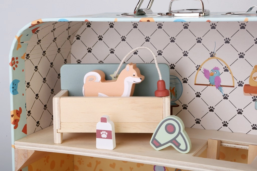 Il set include cagnolini di diverse razze, ciotole, ossa, pesciolini, giochi, cuccia, giacigli, “cibo” e altri accessori in miniatura. Grazie alle dimensioni compatte, la valigetta è facile da trasportare e perfetta per gite, visite e vacanze.