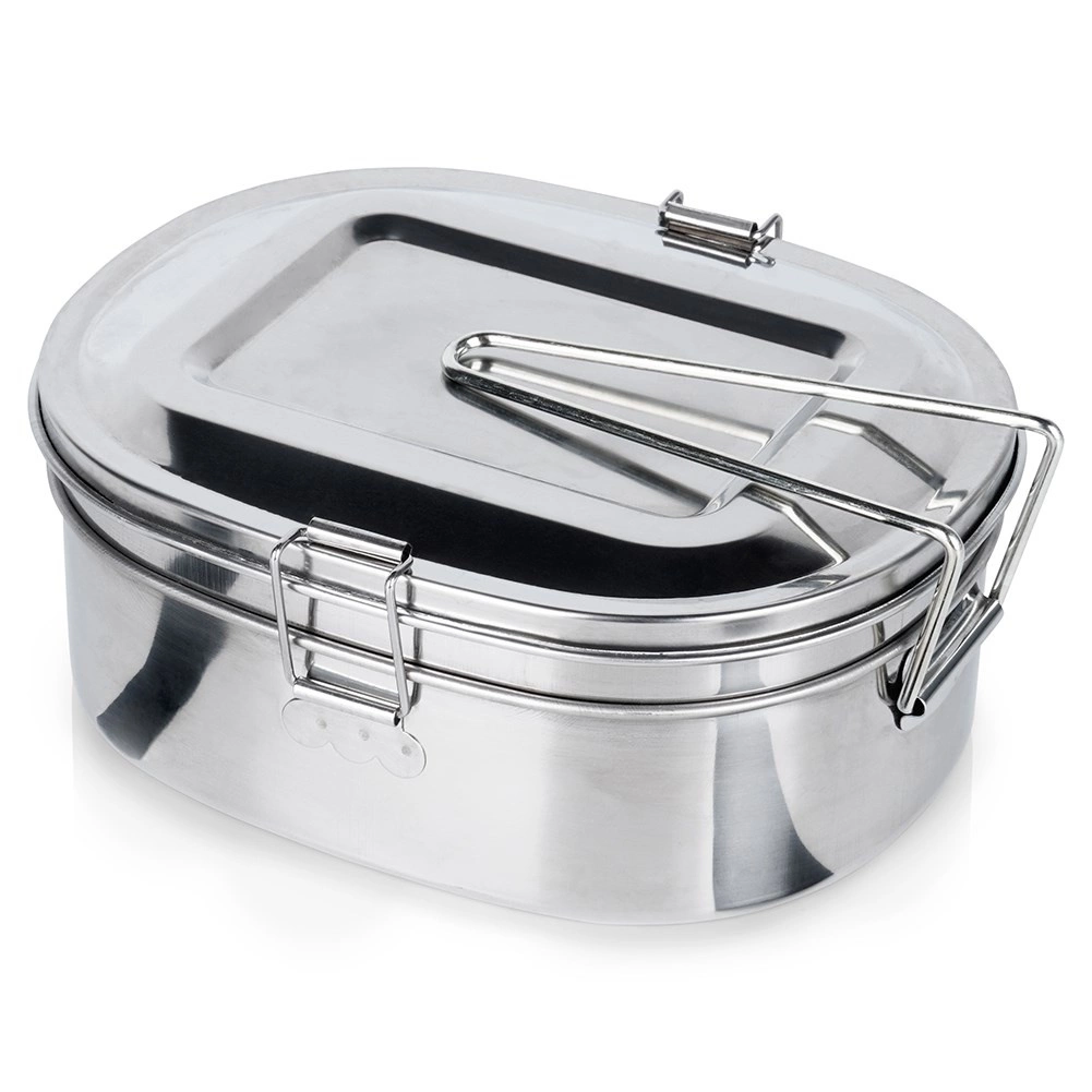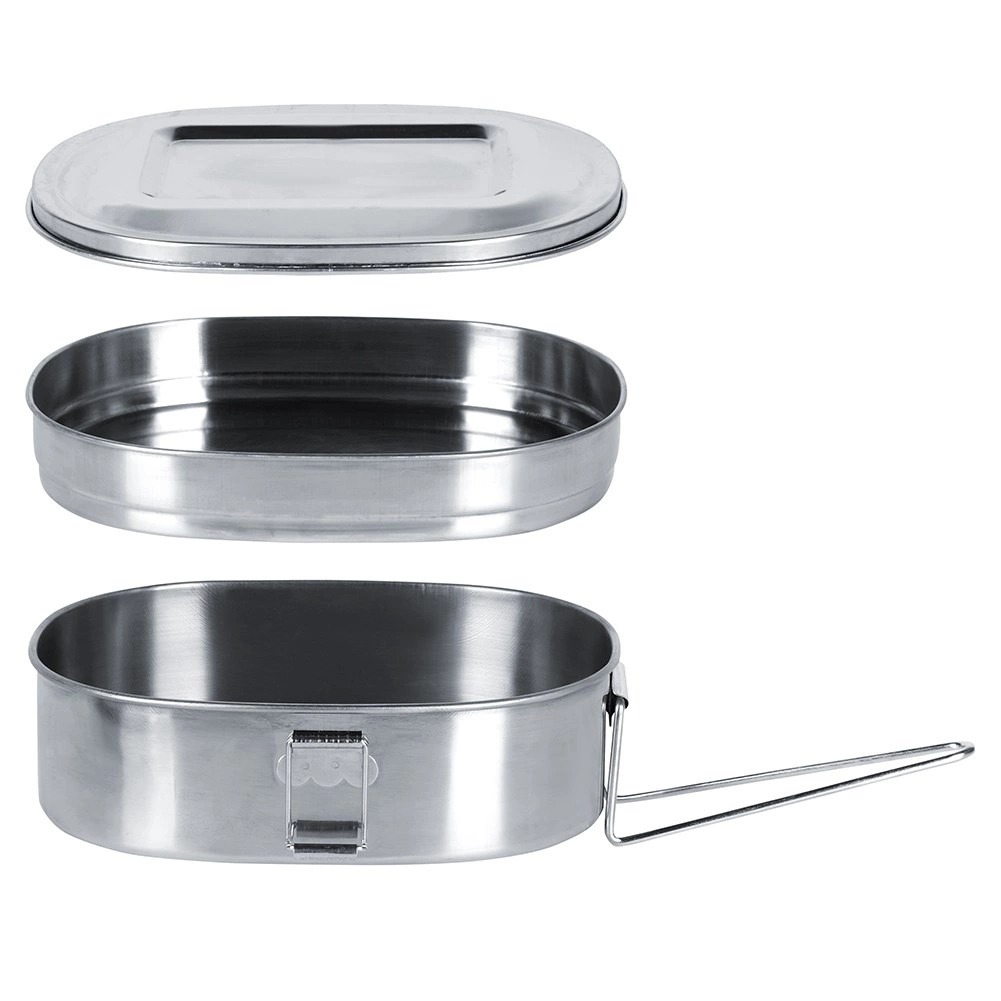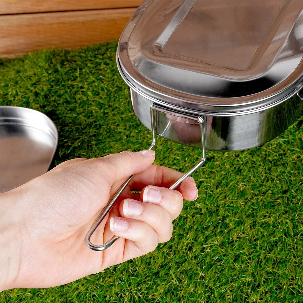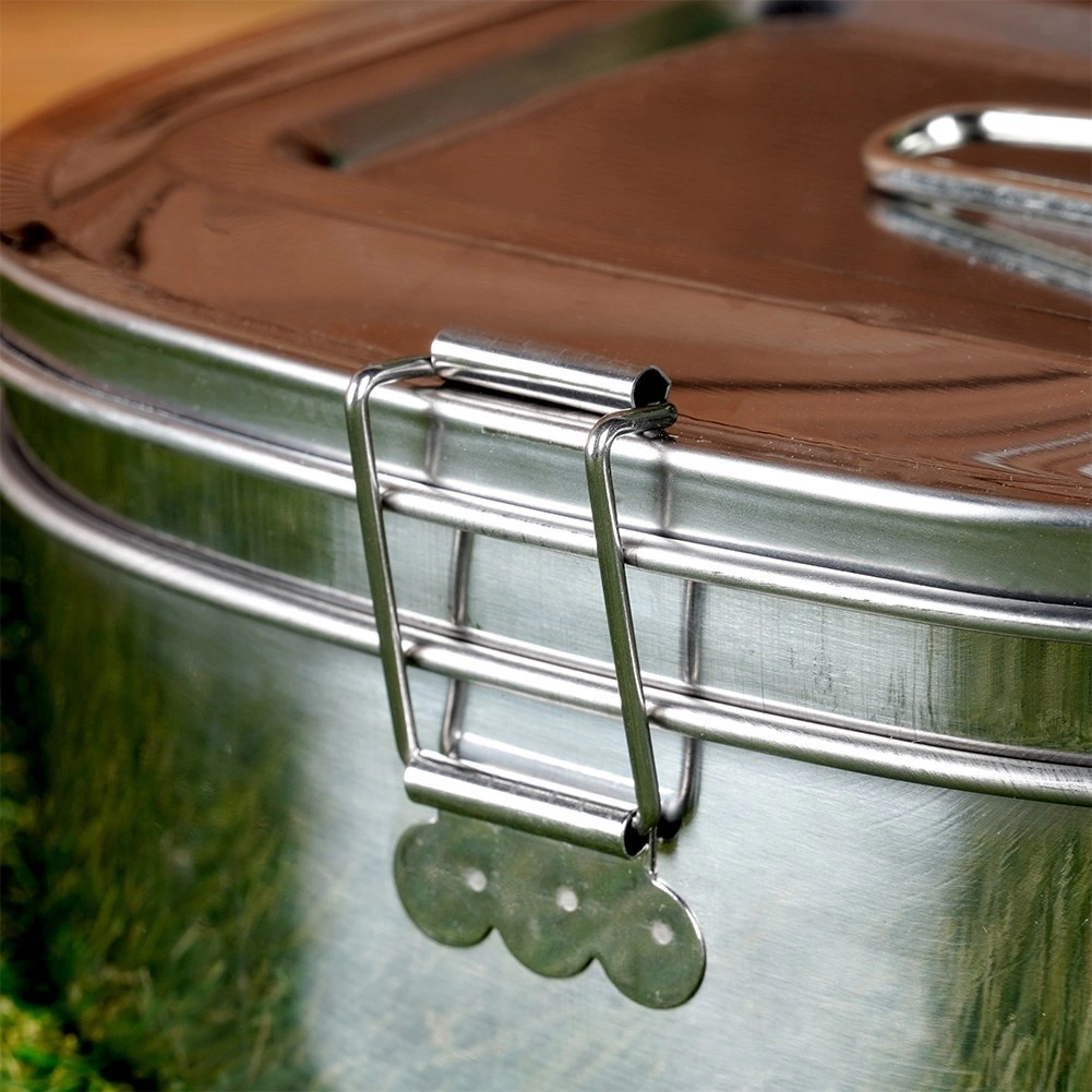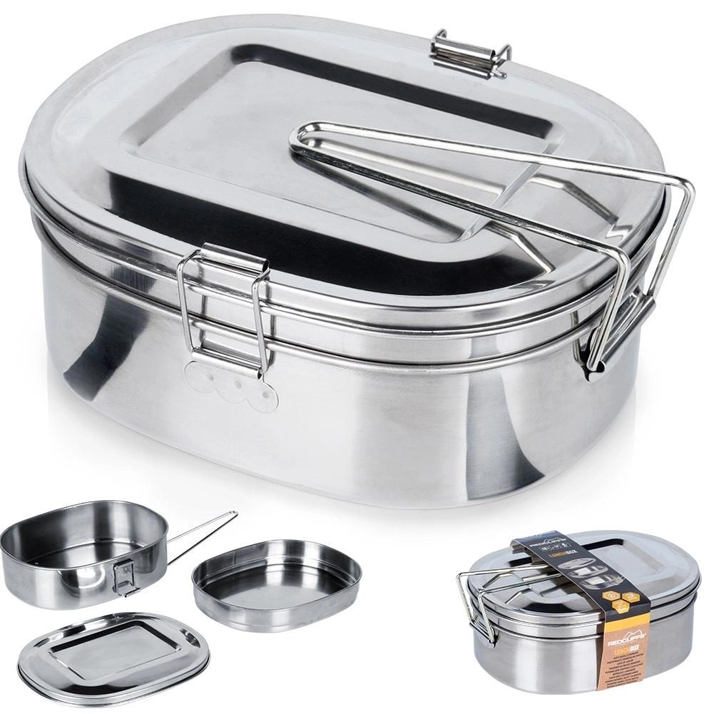 Questo set compatto in acciaio inox di qualità è una soluzione eccellente per pranzi quotidiani e avventure outdoor. Il contenitore principale da 900 ml ospita un piatto sostanzioso, l’inserto più piccolo da 350 ml è ideale per contorni, snack o dessert. Una volta chiuso, forma un insieme stabile con clip affidabili e manico ribaltabile per un facile trasporto.