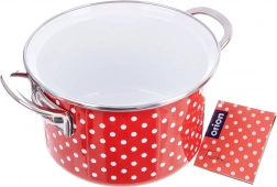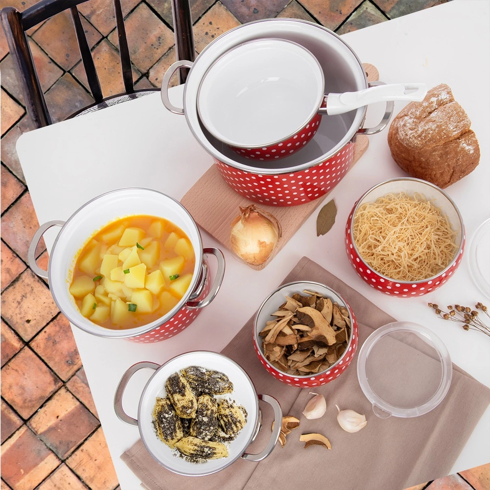 La popolare pentola smaltata in colore rosso con pois bianchi porta in cucina un tocco di stile retrò e allo stesso tempo offre caratteristiche pratiche per la cottura quotidiana. Il corpo solido in acciaio smaltato garantisce una distribuzione uniforme del calore e lunga durata; il bordo in acciaio inox e le robuste impugnature laterali assicurano una manipolazione sicura.