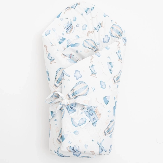 Morbida e calda fasciatura per bambini New Baby Romance per un sonno tranquillo del neonato. Realizzata in 100% cotone con imbottitura anallergica, offre morbidezza, sicurezza e comfort. La bellissima stampa con tema di avventura fiabesca tra le nuvole e la pratica chiusura con laccetto facilitano l’uso quotidiano.