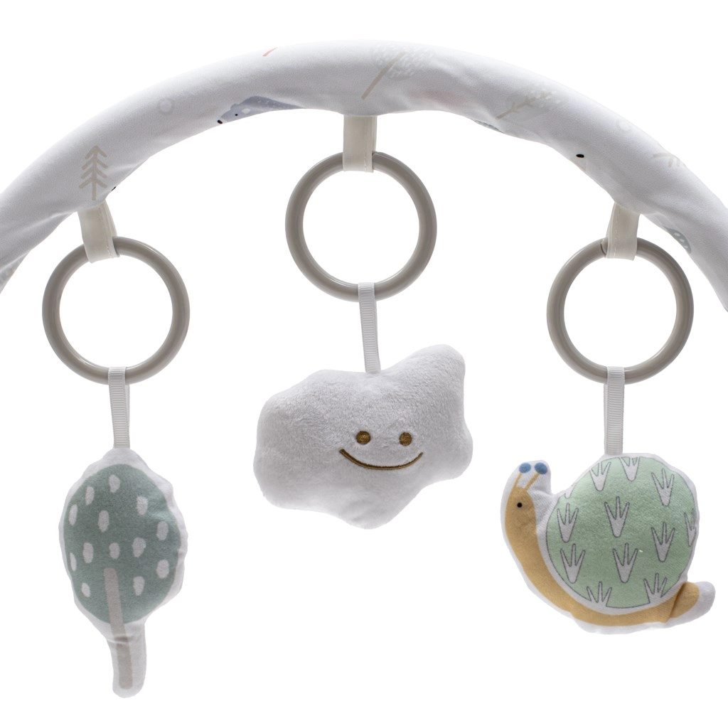 L'arco giochi rimovibile con tre morbidi giocattoli favorisce la coordinazione e lo sviluppo dei sensi. Si rimuove facilmente per la pappa o il sonno.