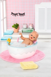 Regala alla tua bambola un momento di relax nella stilosa vasca BABY born in design bianco e blu con l’iconica onda. I bambini si divertiranno con veri giochi d’acqua grazie alla doccetta funzionante: quando la vasca è piena, dall’erogatore scorre davvero l’acqua. Premendo un pulsante si attivano anche effetti luminosi colorati e autentici suoni di spruzzi che intensificano l’atmosfera del bagnetto.