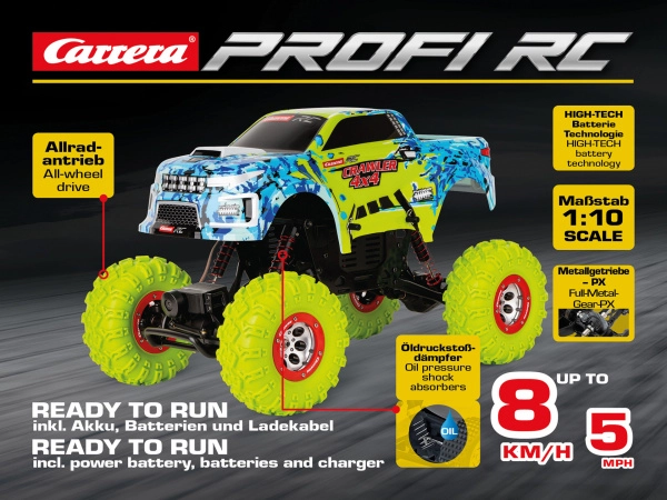 Vivi l’adrenalina off-road con il modello CARRERA PROFI RC Crawler 4x4 in scala 1:10. Offre trazione integrale, controllo digitale proporzionale, ammortizzatori a olio per una guida fluida e design impermeabile. Velocità fino a 8 km/h, grandi pneumatici verde neon con battistrada profondo e configurazione Ready To Run garantiscono divertimento per piloti esigenti dai 14 anni in su.