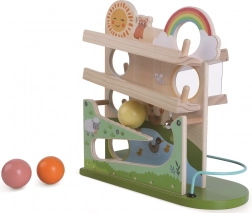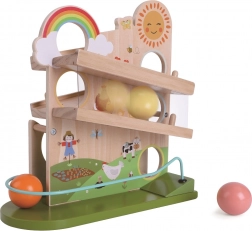 Questa creativa pista delle biglie dal fresco design campestre trasforma ogni momento di gioco in un’avventura colorata. I bambini osservano le biglie che scendono lungo piste con diverse inclinazioni, scompaiono nei fori e riappaiono – il tutto accompagnato da allegre illustrazioni di sole, arcobaleno e animali. La base stabile e i componenti in legno ben rifiniti assicurano una manipolazione sicura anche per i più piccoli.