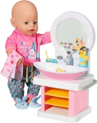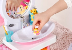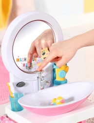 Insegnate ai bambini corrette abitudini igieniche tramite il gioco. Il lavandino bianco e rosa per la bambola BABY born offre effetti luminosi e sonori, un flusso d’acqua reale premendo il rubinetto e adorabili accessori per una cura completa. Quando si illumina lo specchio, parte una melodia che funge da timer giocoso per il lavaggio delle mani.