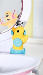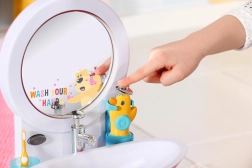 Il divertente lavandino per la bambola BABY born trasforma l’igiene quotidiana in un gioco. Premendo il pulsante si illumina lo specchio e parte una melodia come timer per il lavaggio delle mani. Il dosatore di sapone, l’acqua che scorre premendo il rubinetto e il tappo a forma di paperella rendono il gioco realistico. Inclusi spazzolino da denti, bicchierino con suoni di spazzolamento e asciugamano.