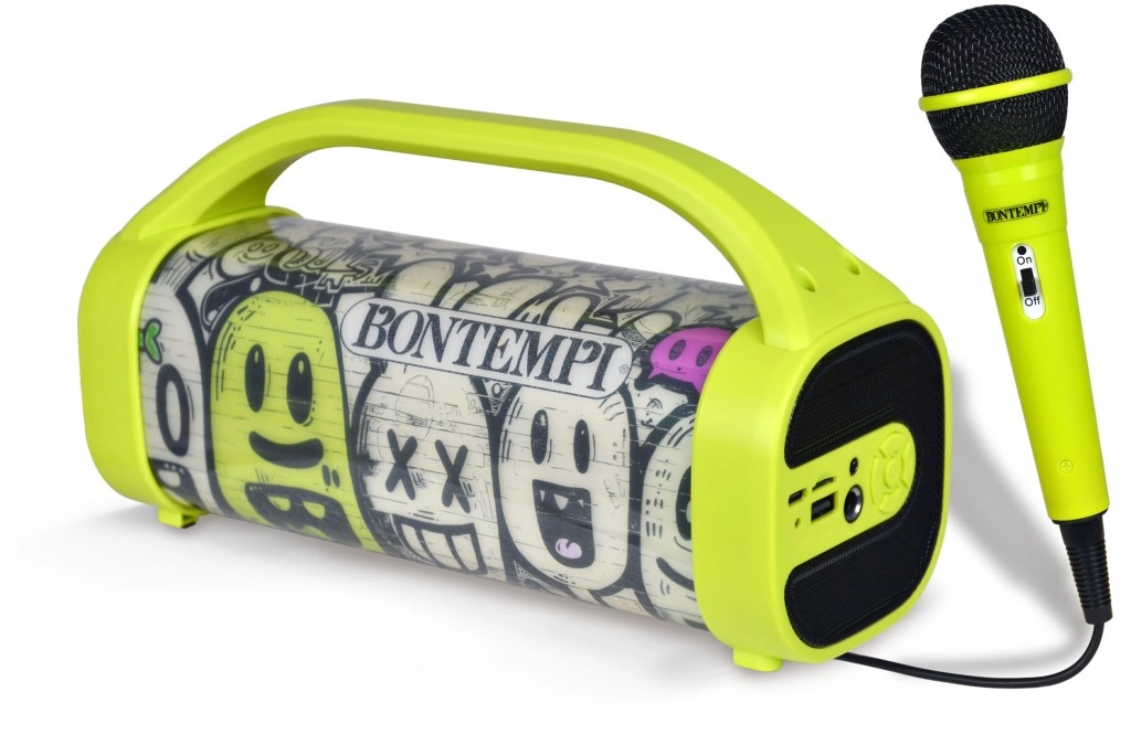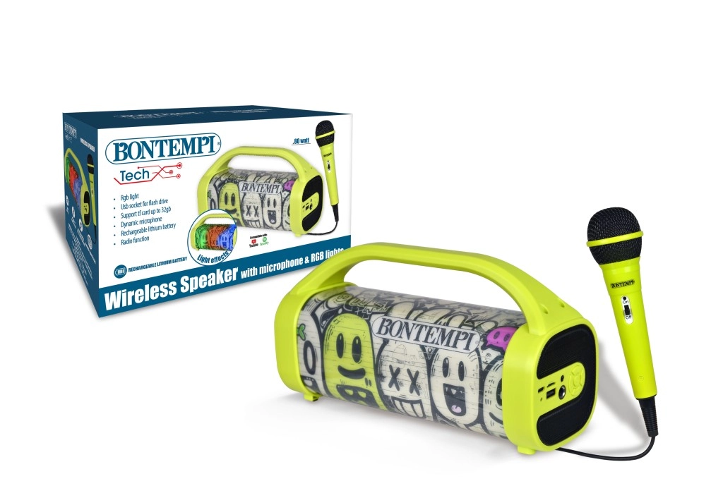 Divertente altoparlante wireless con microfono dinamico per karaoke, feste e party per bambini. Offre connessione Bluetooth, suono pulito e potente, effetti luminosi colorati per la giusta atmosfera ed è compatto e portatile – ideale in viaggio e a casa.