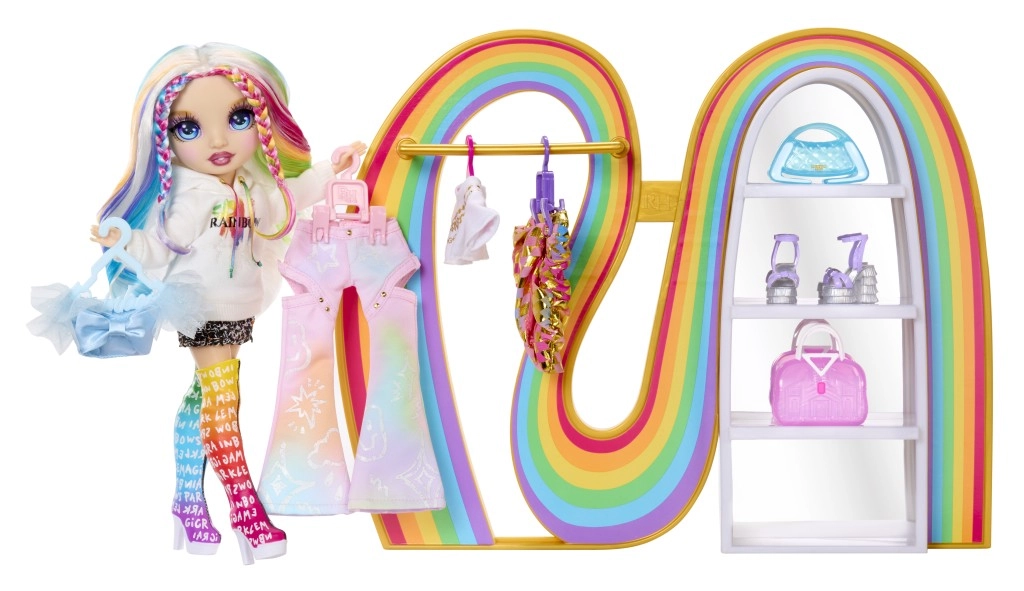 - 1 bambola, guardaroba/stand arcobaleno, 6 capi di abbigliamento, 2 paia di scarpe, 2 borse, pettine, stand con 4 appendini, 4 ripiani a livelli per le scarpe