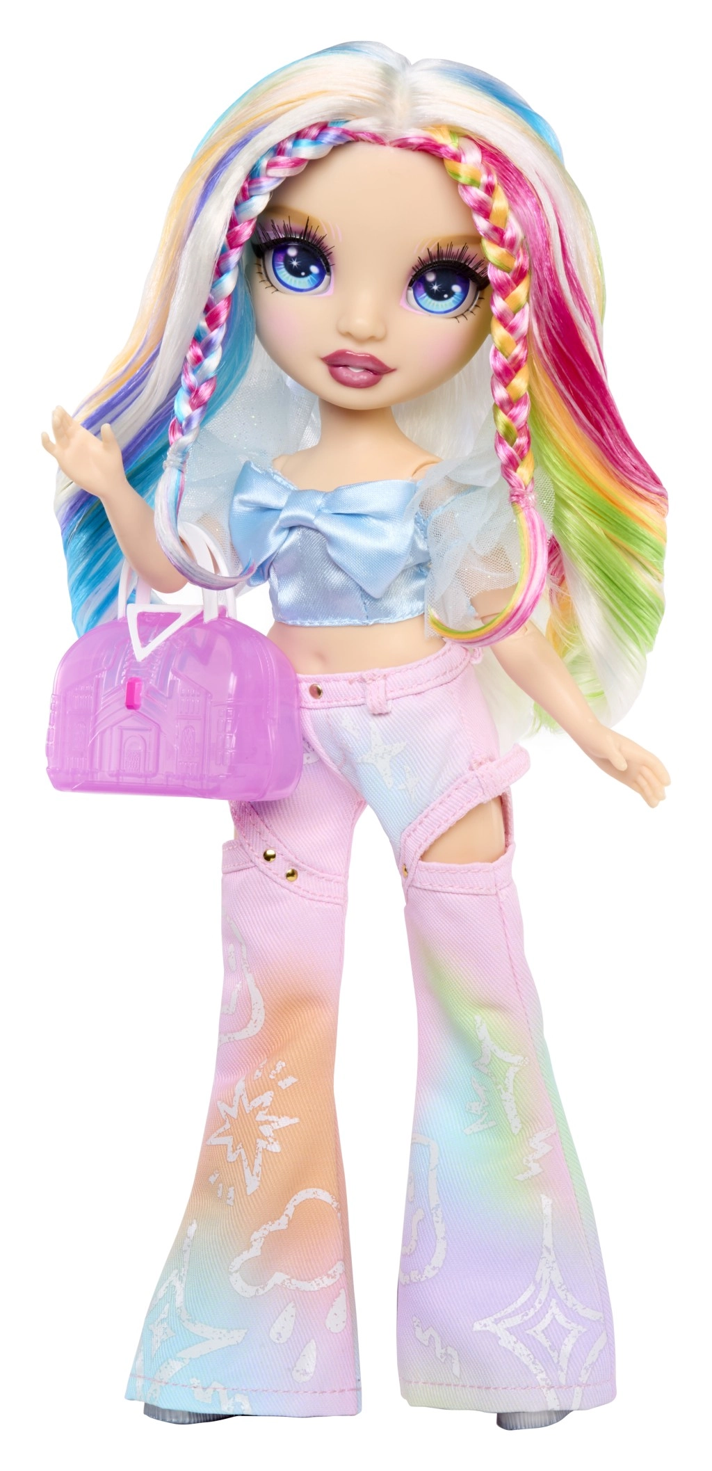 Bambola con lunghi capelli arcobaleno e accessori dettagliati, perfetta per posare, fotografare e giocare alle sfilate di moda.