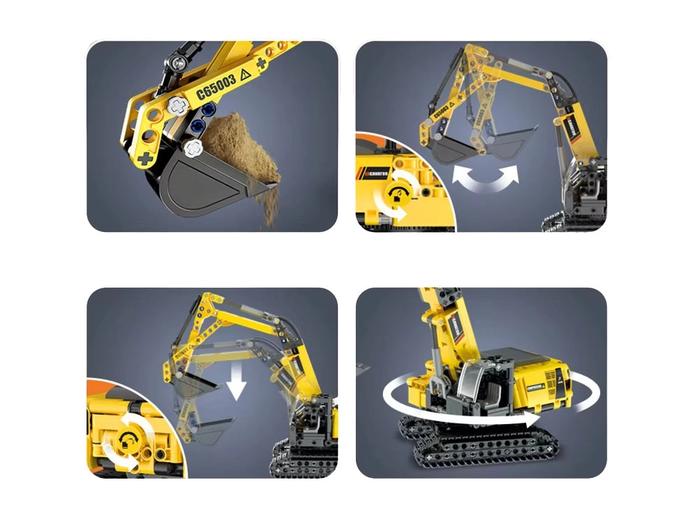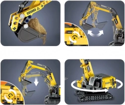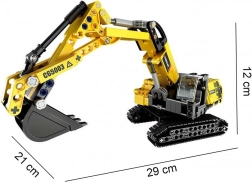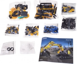 Il montaggio è fluido grazie ai pezzi perfettamente combacianti e la costruzione finale è solida e stabile. La colorazione giallo‑grigia e gli adesivi ne esaltano l’aspetto realistico. L’escavatore ha un braccio funzionale con possibilità di sollevamento, benna mobile, cabina girevole a 360° e cingoli per un movimento scorrevole.