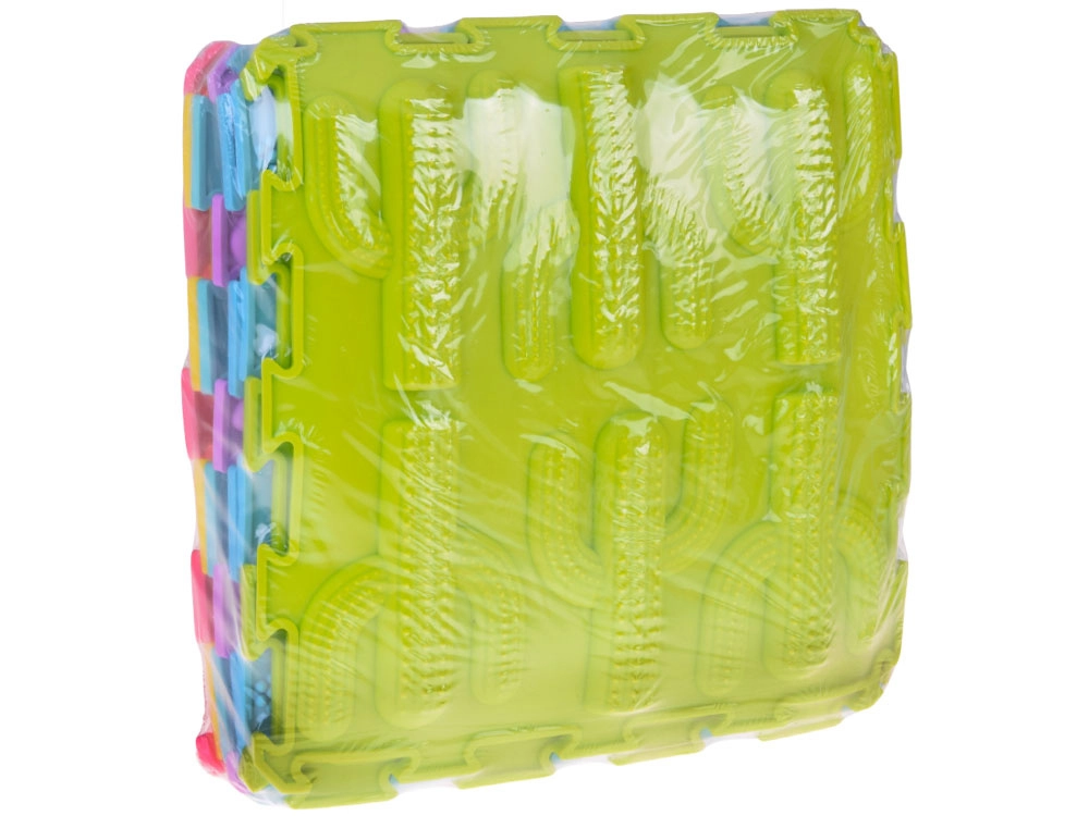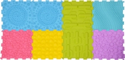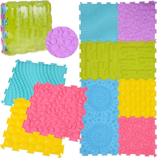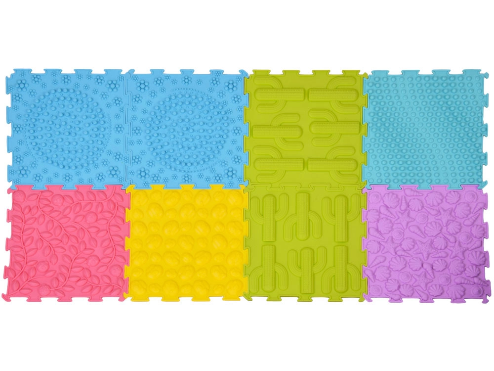 Il tappetino sensoriale composto da otto pezzi collegabili (24,5 × 24,5 cm, spessore ca. 1 cm) offre texture varie – cactus, foglie con coccinelle, conchiglie, fiori e diverse cupole e puntini. I singoli elementi possono essere combinati liberamente e assemblati in un rettangolo, una striscia o un quasi quadrato, così da adattare facilmente il tappetino allo spazio e all’attività.