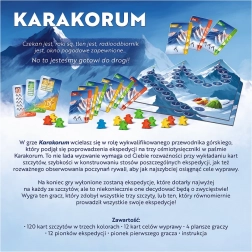 Parti per una spedizione avventurosa nella catena del Karakoram in un avvincente gioco da tavolo di Reiner Knizia. Come esperta guida alpina pianifichi ascensioni a tre ottomila, dove contano la tattica nel giocare le carte, la rapidità nel costruire i mazzi di spedizione e la vigile osservazione degli avversari. Ideale per gli amanti dei giochi strategici e della tematica alpinistica.