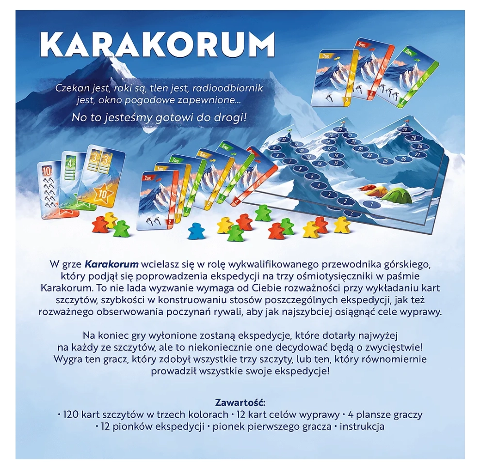 Diventa il re delle montagne nell’atmosferico KARAKORUM: King of the Mountains. Nei panni del capo spedizione scegli il momento giusto per calare le carte vetta, componi con cura i mazzi delle singole ascese e ti adatti ai cambi di ritmo degli avversari. Ogni decisione avvicina la tua squadra all’obiettivo: conquistare tre leggendari ottomila.