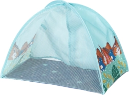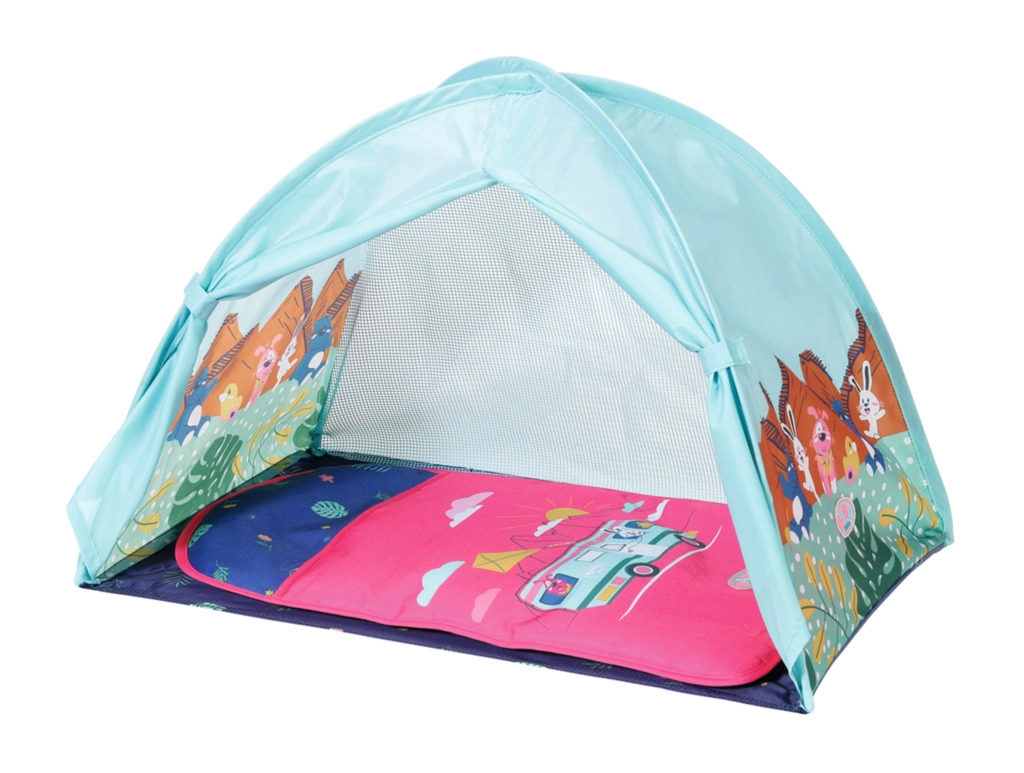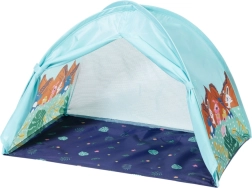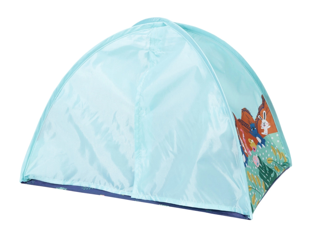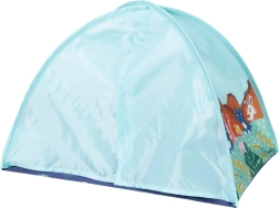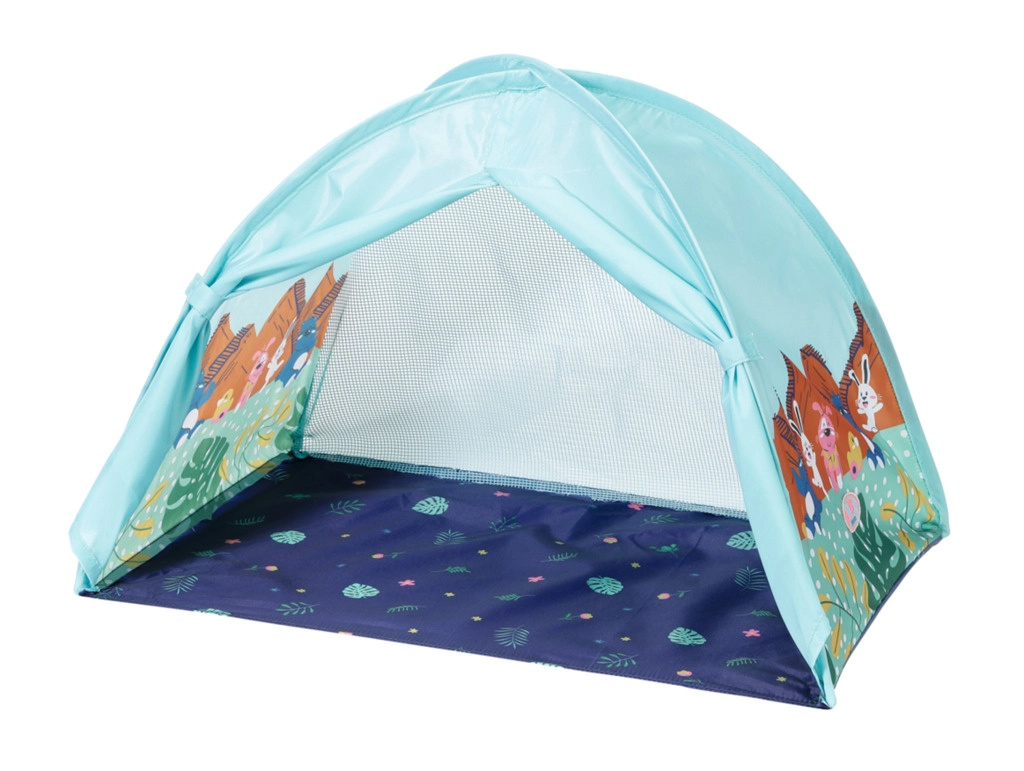 La tenda turchese con disegni di amici animali permette ai bambini di provare l'autenticità del campeggio, offrendo un ottimo spazio per l'immaginazione.< /p>