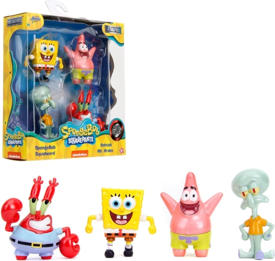 Set ufficialmente licenziato di quattro figure della serie animata SpongeBob SquarePants del brand Jada Toys. Robusta realizzazione in metallo (die‑cast), colori vivaci e personaggi iconici – SpongeBob, Patrick, Squiddi e Mr. Krabs. Perfette per collezionisti, decorazione e gioco leggero.