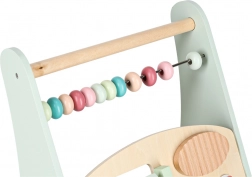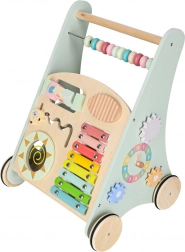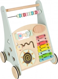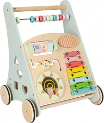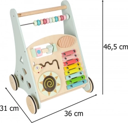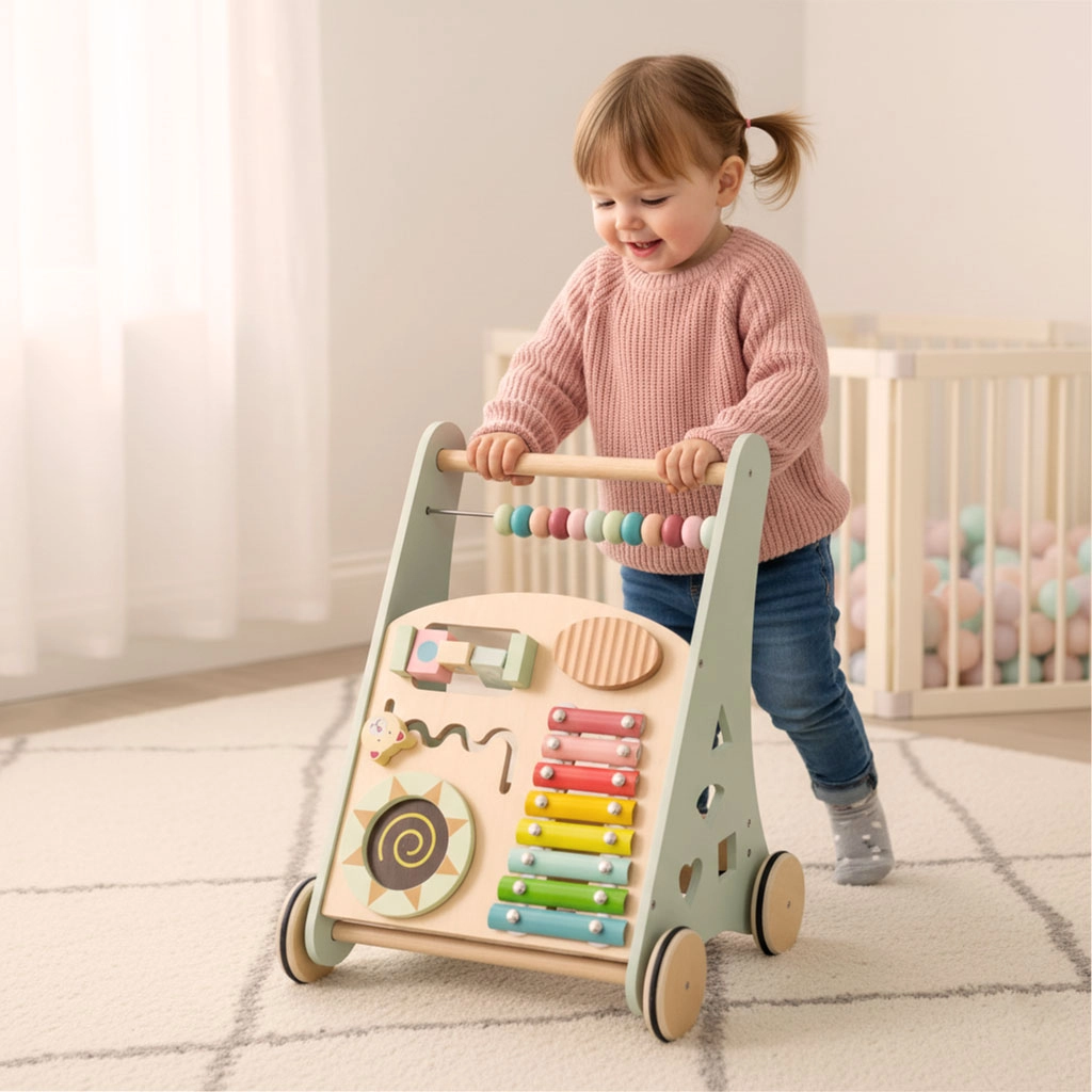 Il girello multifunzione in legno unisce il supporto per i primi passi a un centro attività giocoso. Il bambino allena equilibrio, coordinazione mano–occhio e motricità fine spingendo, facendo girare o inserendo le forme. I colori pastello e il legno levigato invitano all’esplorazione, mentre lo xilofono favorisce ritmo e orecchio musicale.