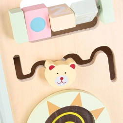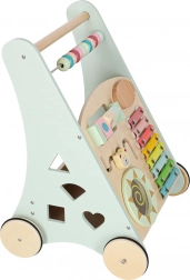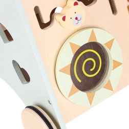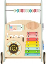 Sul pannello frontale trovi xilofono con bacchette, abaco per i primi passi nel conteggio e scatola incastri forme per imparare colori e forme. Ingranaggi, labirinto con perline e orologio sviluppano il pensiero logico e la comprensione di causa ed effetto. Le fasce in gomma delle ruote garantiscono migliore aderenza e scorrimento silenzioso.
