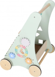 La struttura in legno stabile, la comoda maniglia e le quattro ruote con fascia in gomma aiutano il bambino ad allenare in sicurezza camminata ed equilibrio.