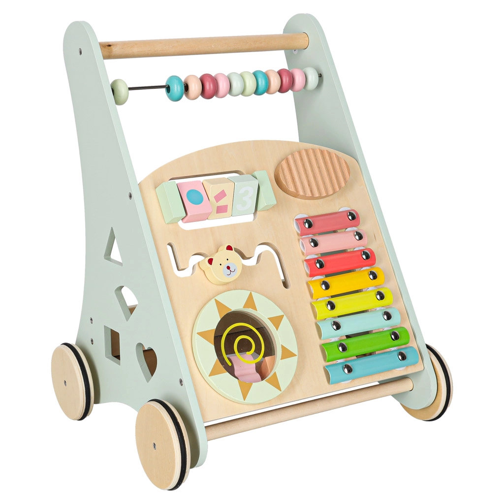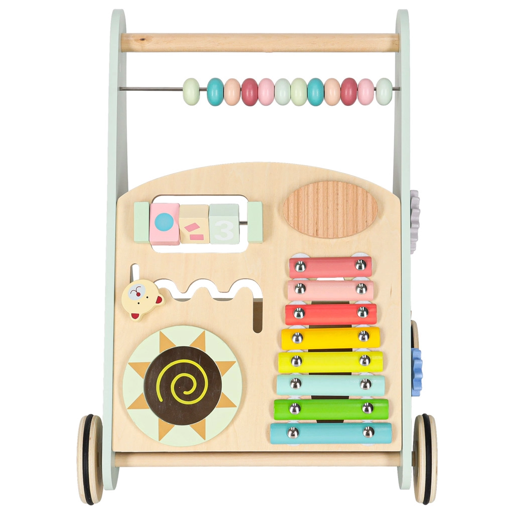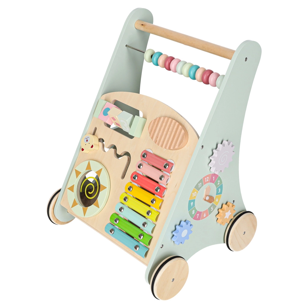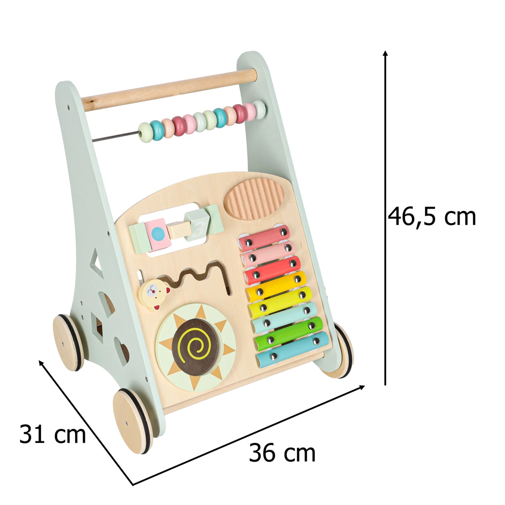 Il robusto girello in legno con abaco e ricco pannello attività aiuta i bambini dai 12 mesi a imparare a camminare e a scoprire il mondo. Offre xilofono, abaco, scatola incastri forme, ingranaggi, labirinto con perline e orologio. Grazie alla struttura solida, alle ruote gommate e ai colori a base d’acqua sicuri sviluppa motricità, sensi e logica – e il divertimento dura davvero a lungo.