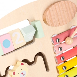 Lo xilofono integrato con 2 bacchette in legno sviluppa udito, senso del ritmo e coordinazione; gli elementi colorati stimolano vista e tatto.
