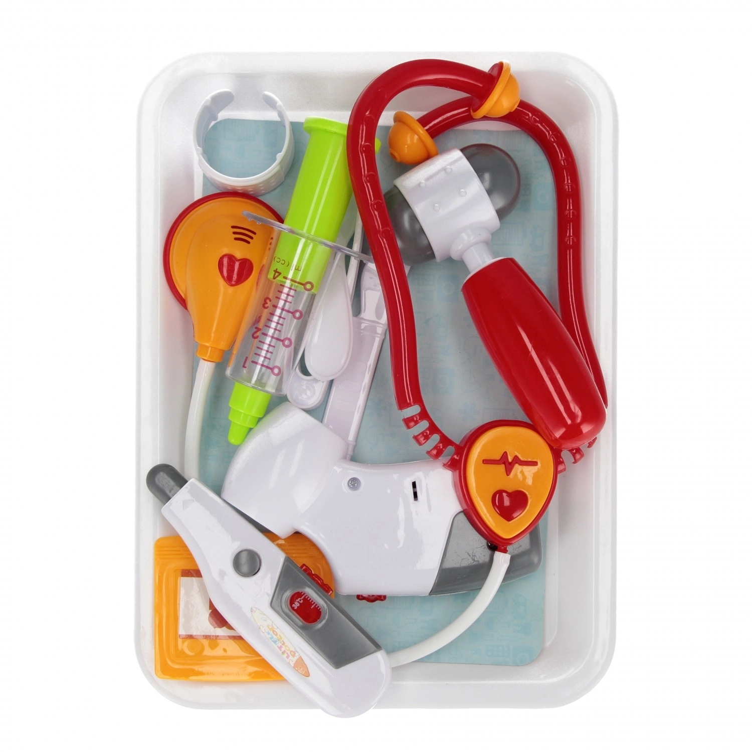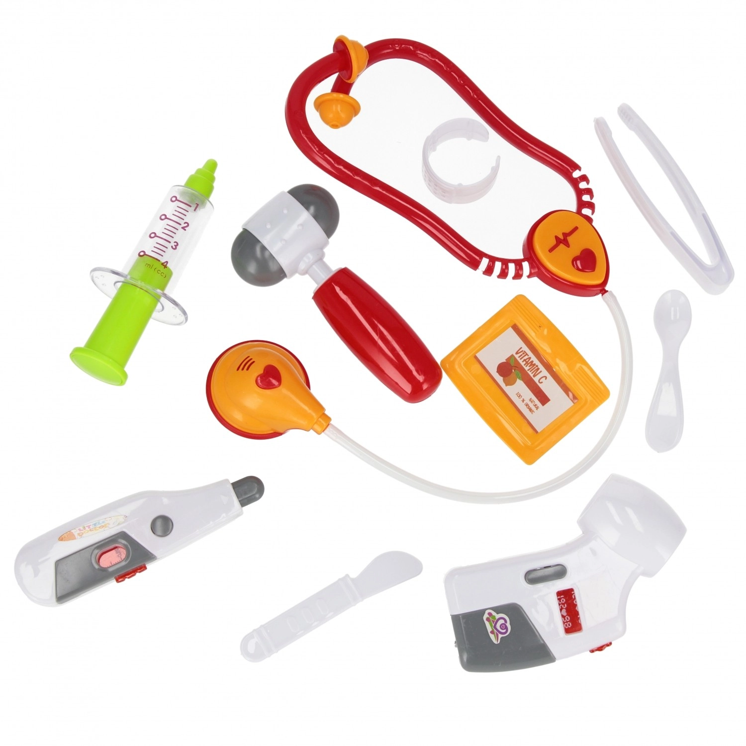 La confezione include vassoio, stetoscopio, siringa, pinzetta, cerotto, coltellino, cucchiaino, martelletto riflessi, pulsossimetro, termometro e tesserino identificativo. Ideale per il gioco condiviso tra fratelli e amici e per un primo avvicinamento all’ambiente medico attraverso un’imitazione sicura.