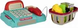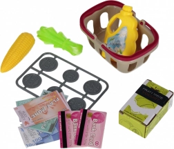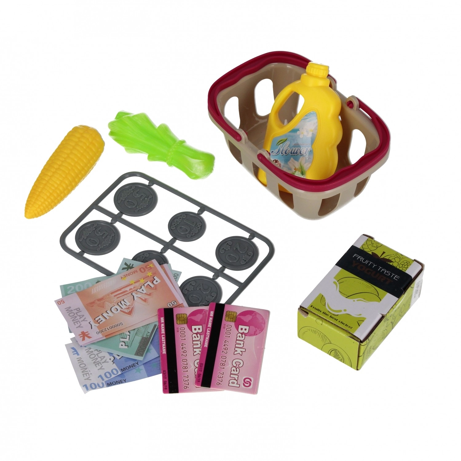 Include alimenti in plastica, un cestino, banconote e monete giocattolo – tutto il necessario per un gioco di negozio completo.