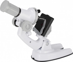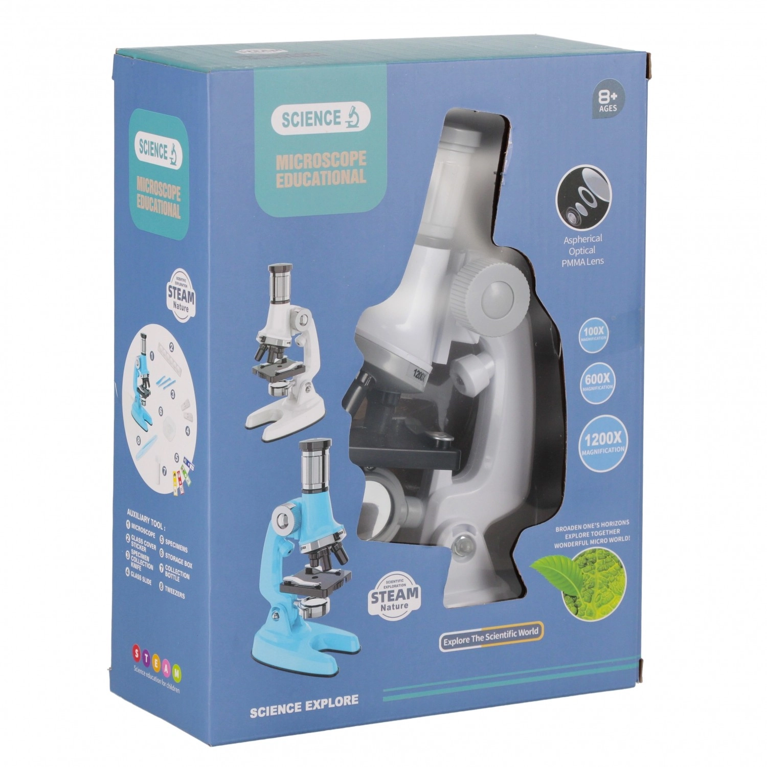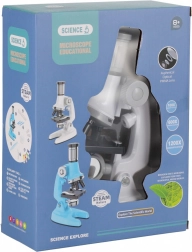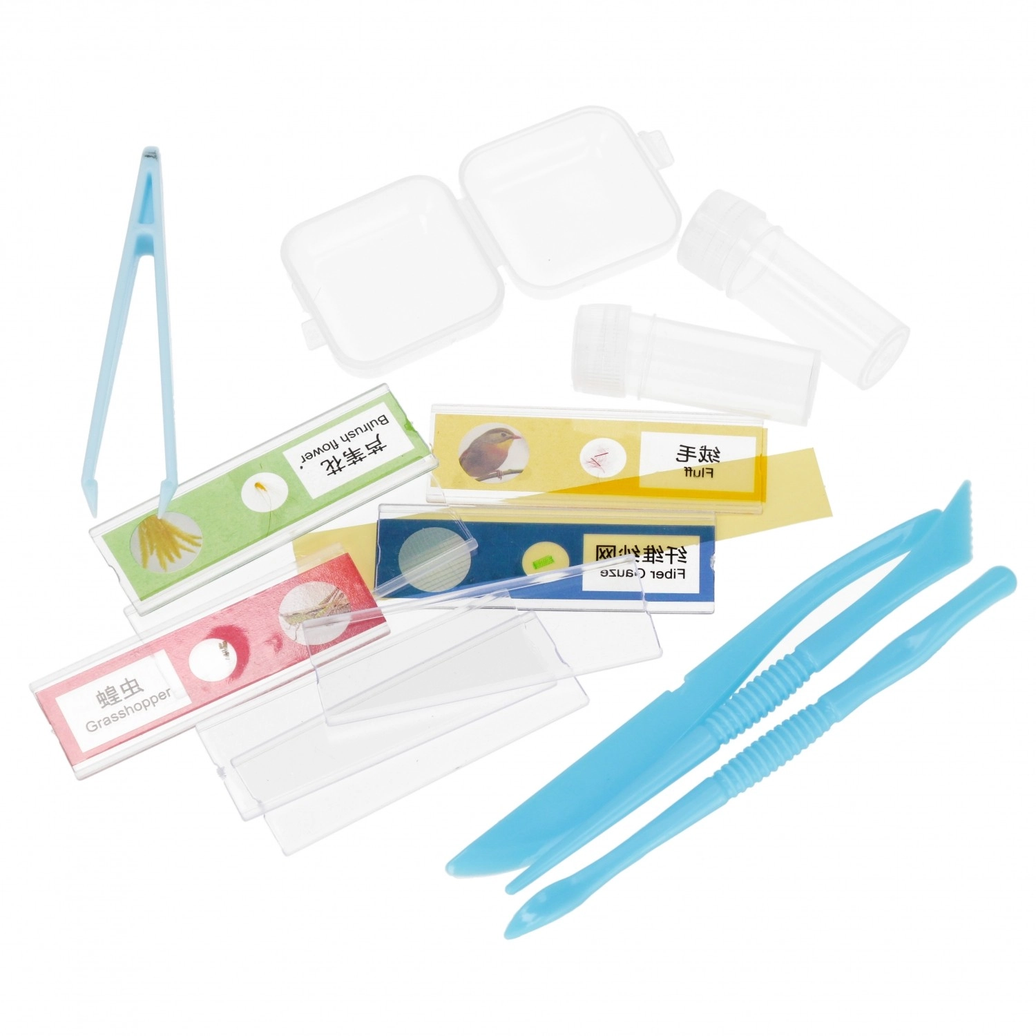 - Set completo: microscopio, 1× pinzetta, 3× lame/vetrini portaoggetti, 2× provette, 1× scatolina, 4× schede di ricerca con disegni, 4× schede vuote, manuale
