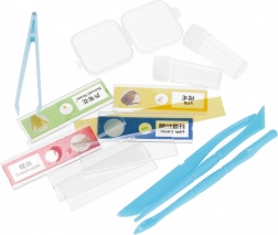 - Microscopio, 1× pinzetta, 3× lame/vetrini portaoggetti, 2× provette, 1× scatolina, 4× schede di ricerca con disegni, 4× schede, manuale
