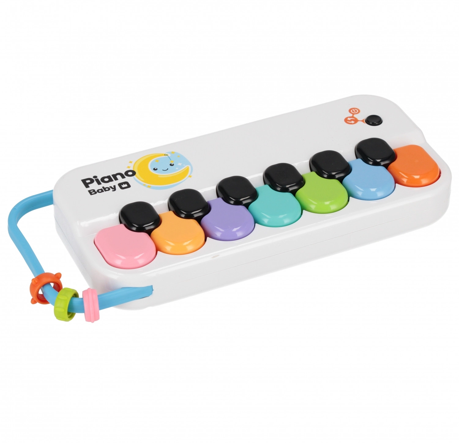 Divertente pianoforte per bambini con 8 tasti colorati che sviluppano udito, senso del ritmo e motricità fine. Struttura leggera e portatile con maniglia blu, effetti sonori e melodici, adatto ai bambini da 18 mesi. Alimentazione con 3× AA batterie.