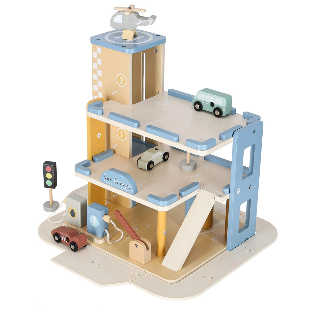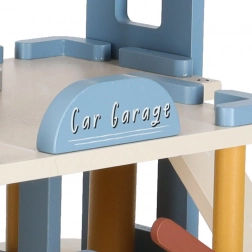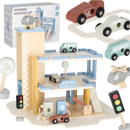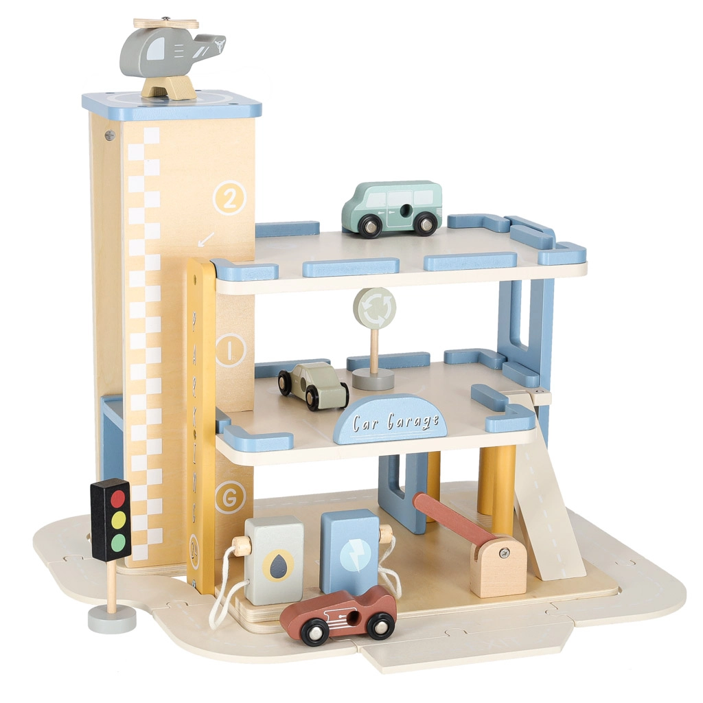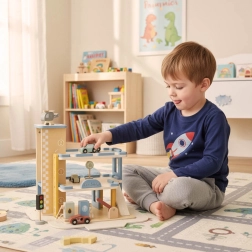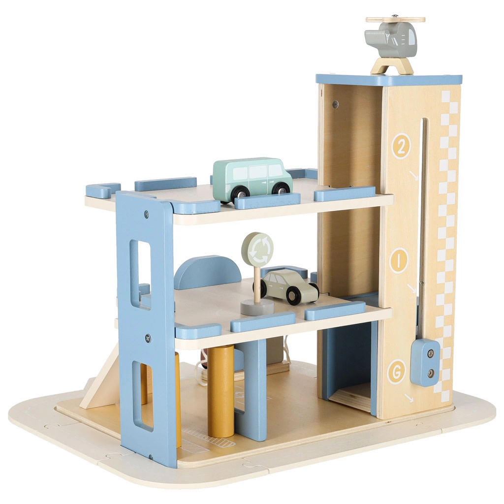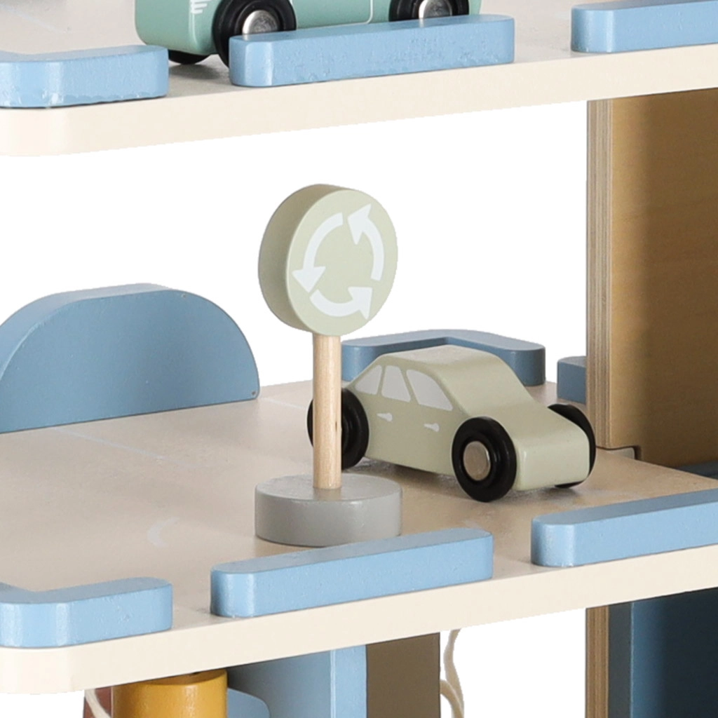 Questo parcheggio in legno a più livelli unisce garage, officina e stazione di benzina in uno. I bambini possono sollevare le auto con l’ascensore mobile, percorrere le rampe, parcheggiare ai vari piani e fare rifornimento. Le delicate tonalità pastello e la finitura in legno levigato sono piacevoli al tatto e valorizzano qualsiasi cameretta.