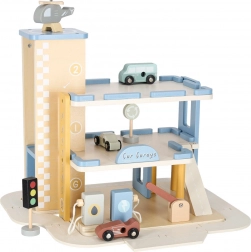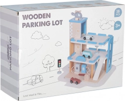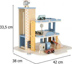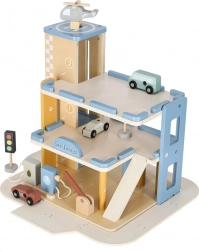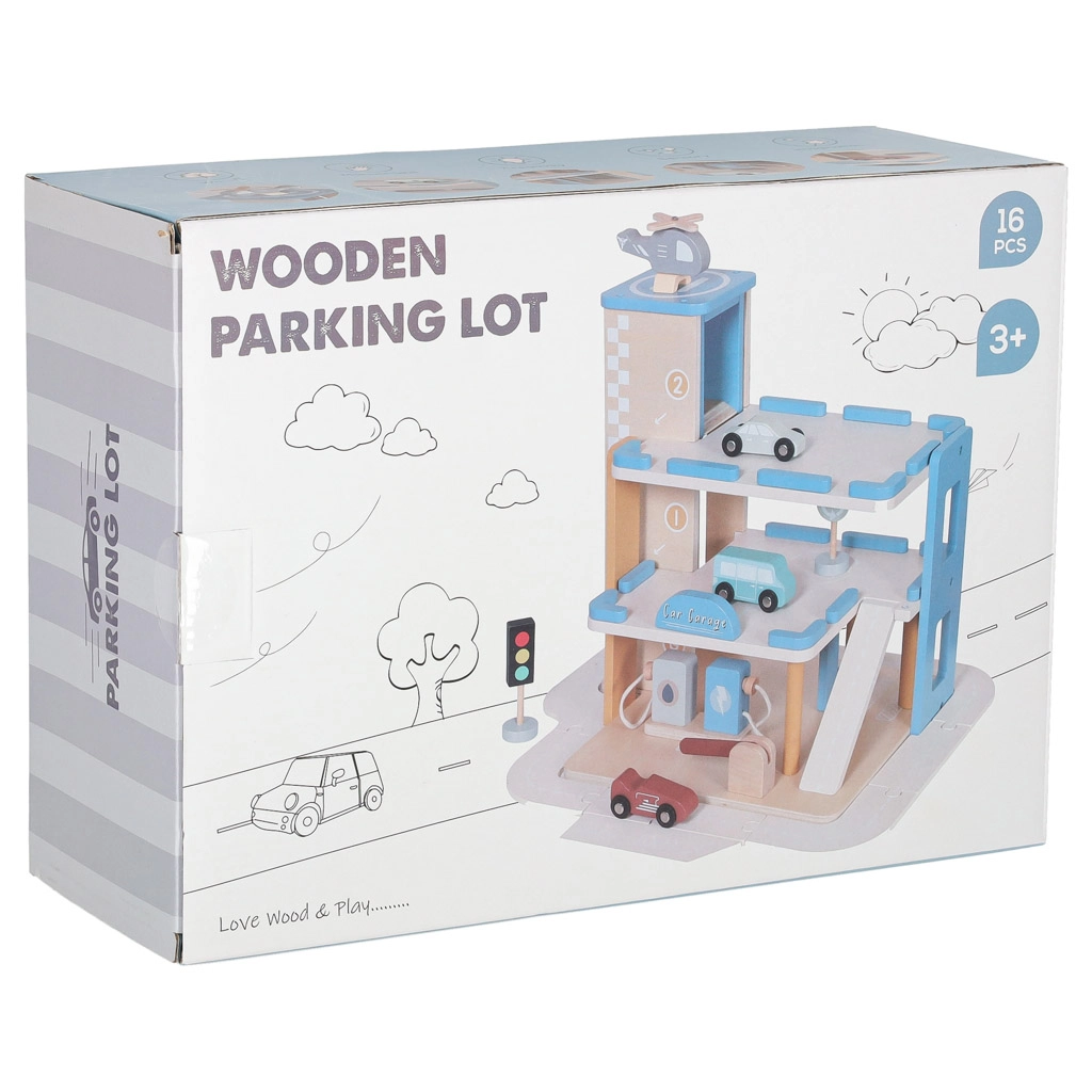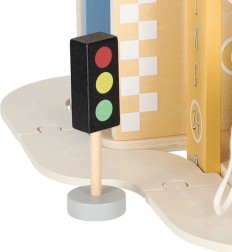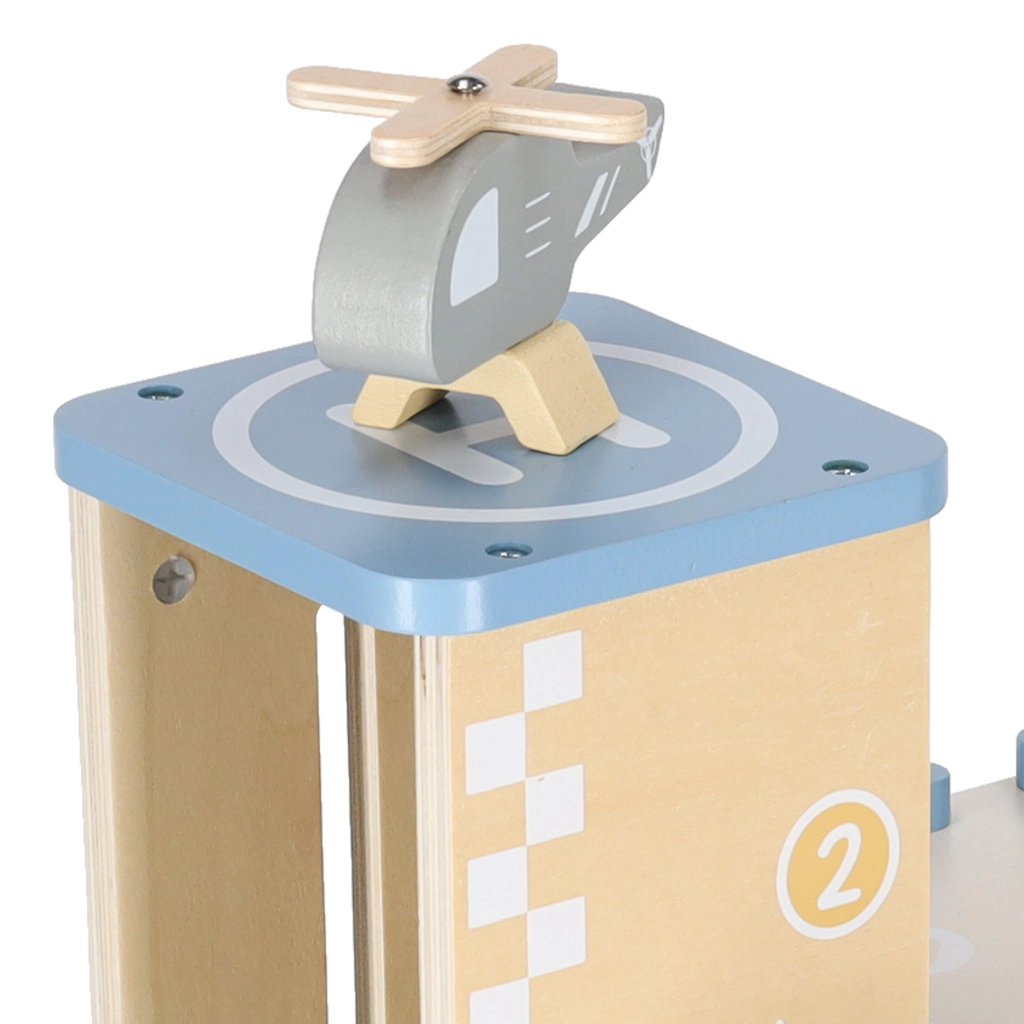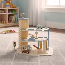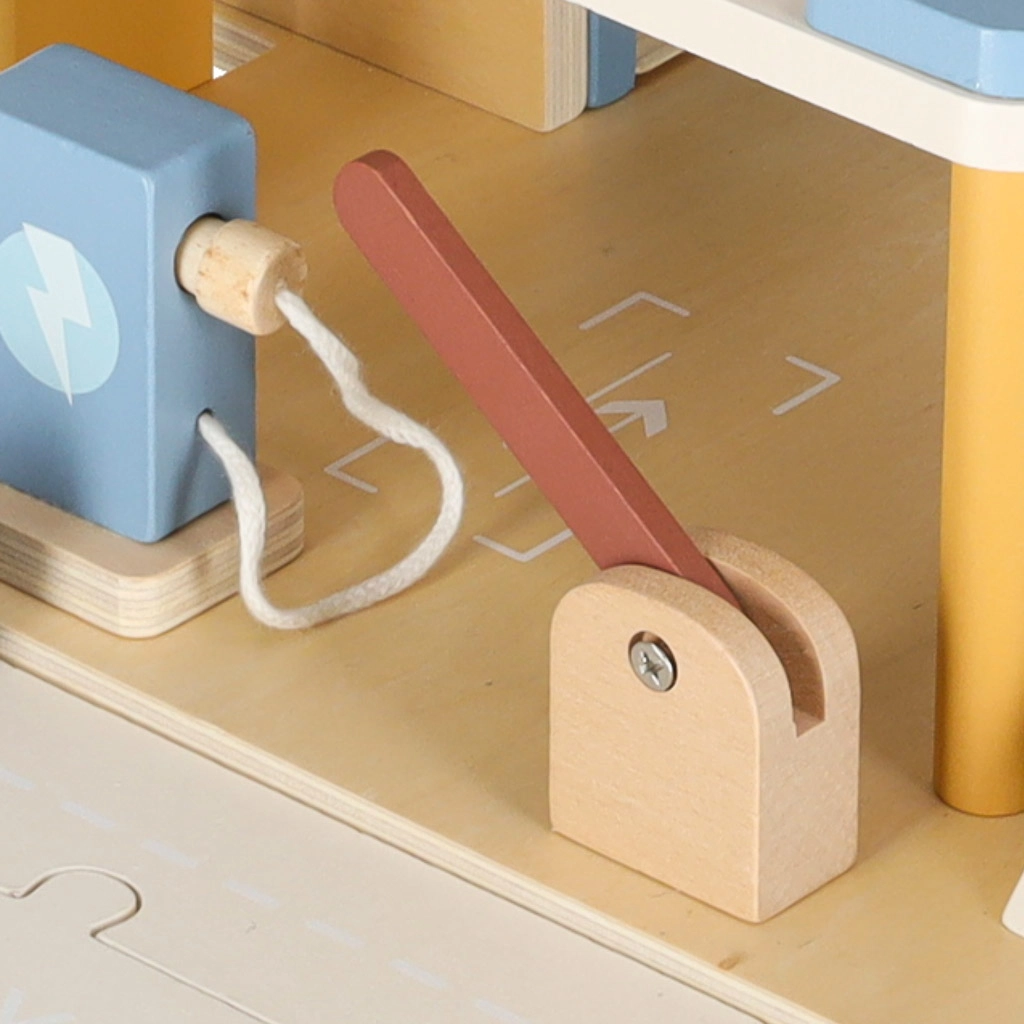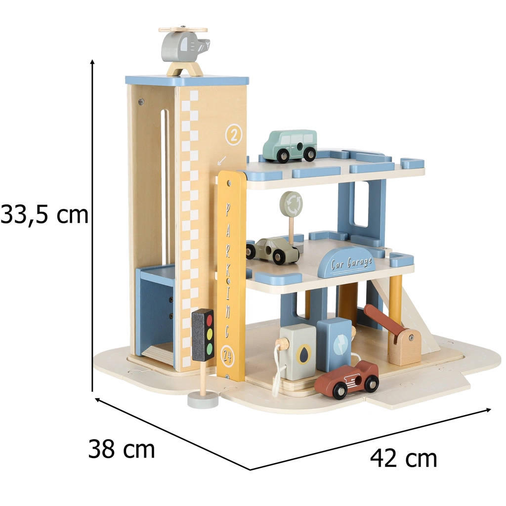 Questo parcheggio in legno a più livelli unisce garage, officina e stazione di benzina in uno. I bambini possono sollevare le auto con l’ascensore mobile, percorrere le rampe, parcheggiare ai vari piani e fare rifornimento. Le delicate tonalità pastello e la finitura in legno levigato sono piacevoli al tatto e valorizzano qualsiasi cameretta.