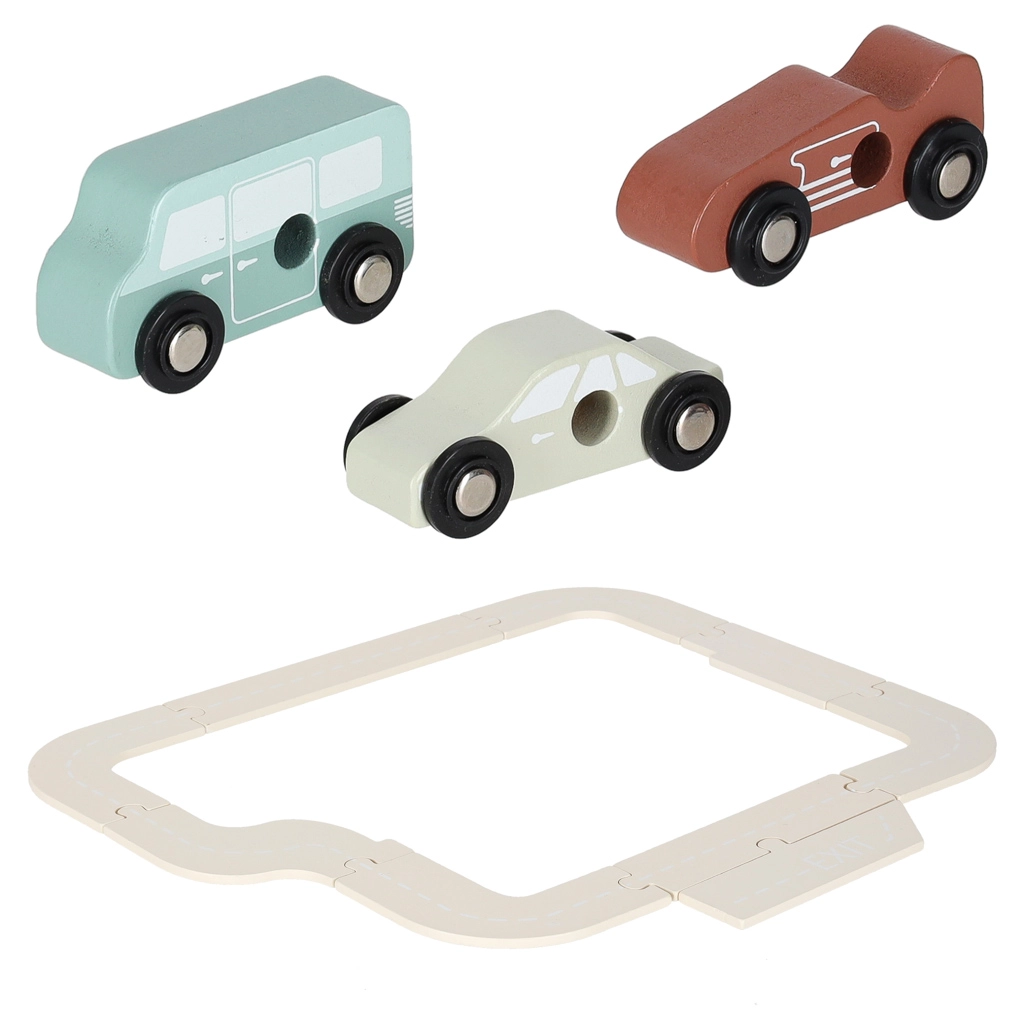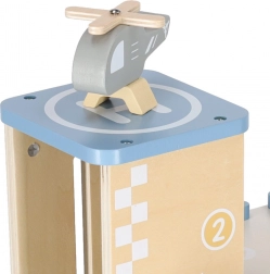 Nella confezione troverete 3 macchinine in legno e un elicottero per mettere in scena salvataggi, gare e tranquilli momenti di parcheggio.