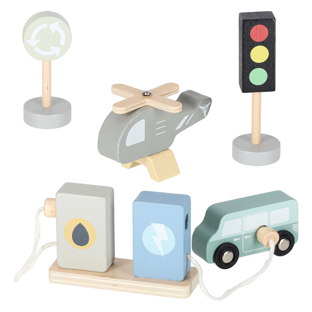 È incluso tutto il necessario per un gioco realistico: 3 macchinine, elicottero, segnali stradali, sbarra, pompa e segmenti di strada. Il set sviluppa in modo naturale la coordinazione occhio–mano, la logica e le abilità sociali durante il gioco con gli amici.