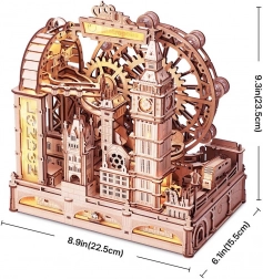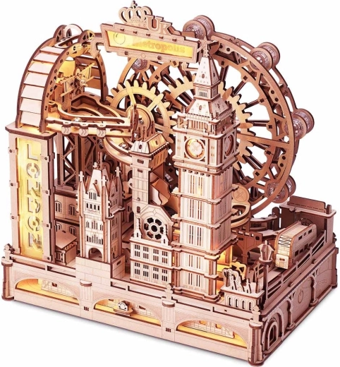 Scopri le iconiche attrazioni londinesi sotto forma di un elegante puzzle 3D in legno. Il modello combina Big Ben, Tower Bridge e London Eye con una dinamica pista a biglie, dove le sfere metalliche sfrecciano su rampe e tunnel grazie alla gravità e a un potente motore. Non mancano nemmeno i simbolici Gioielli della Corona – il tutto con la massima cura per la precisione costruttiva.