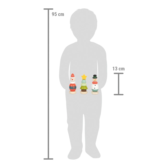 Scoprite la gioia dell’impilare a tema natalizio! Le figurine in legno a forma di BABBO NATALE, albero di Natale con stella dorata e simpatico pupazzo di neve sono composte da diversi anelli e pezzi colorati da infilare su un robusto piolo. Il gioco motiva intuitivamente i bambini ad allenare la presa, la precisione e la concentrazione – creando al contempo una splendida atmosfera festiva nella cameretta e in salotto.