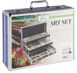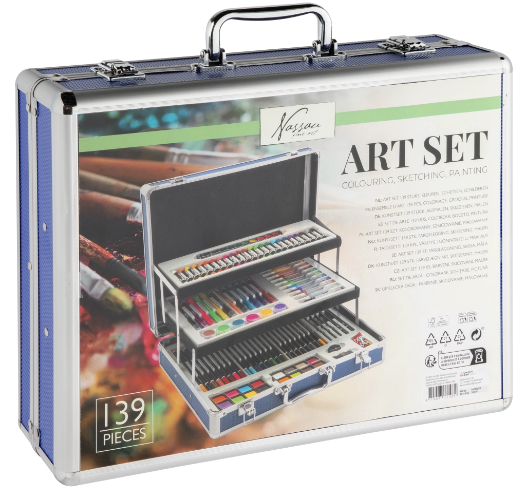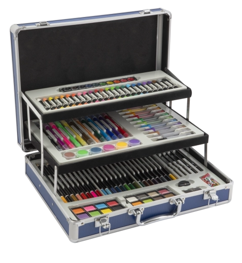 Set creativo completo per piccoli e grandi artisti in una pratica valigetta metallica. Contiene fino a 140 pezzi di materiali artistici – matite colorate, pennarelli, pastelli a cera, acquerelli, pennelli, temperino, gomma e altri accessori. Grazie ai vassoi pieghevoli a scomparti avrai tutto ordinato e pronto per creare a casa e in viaggio.