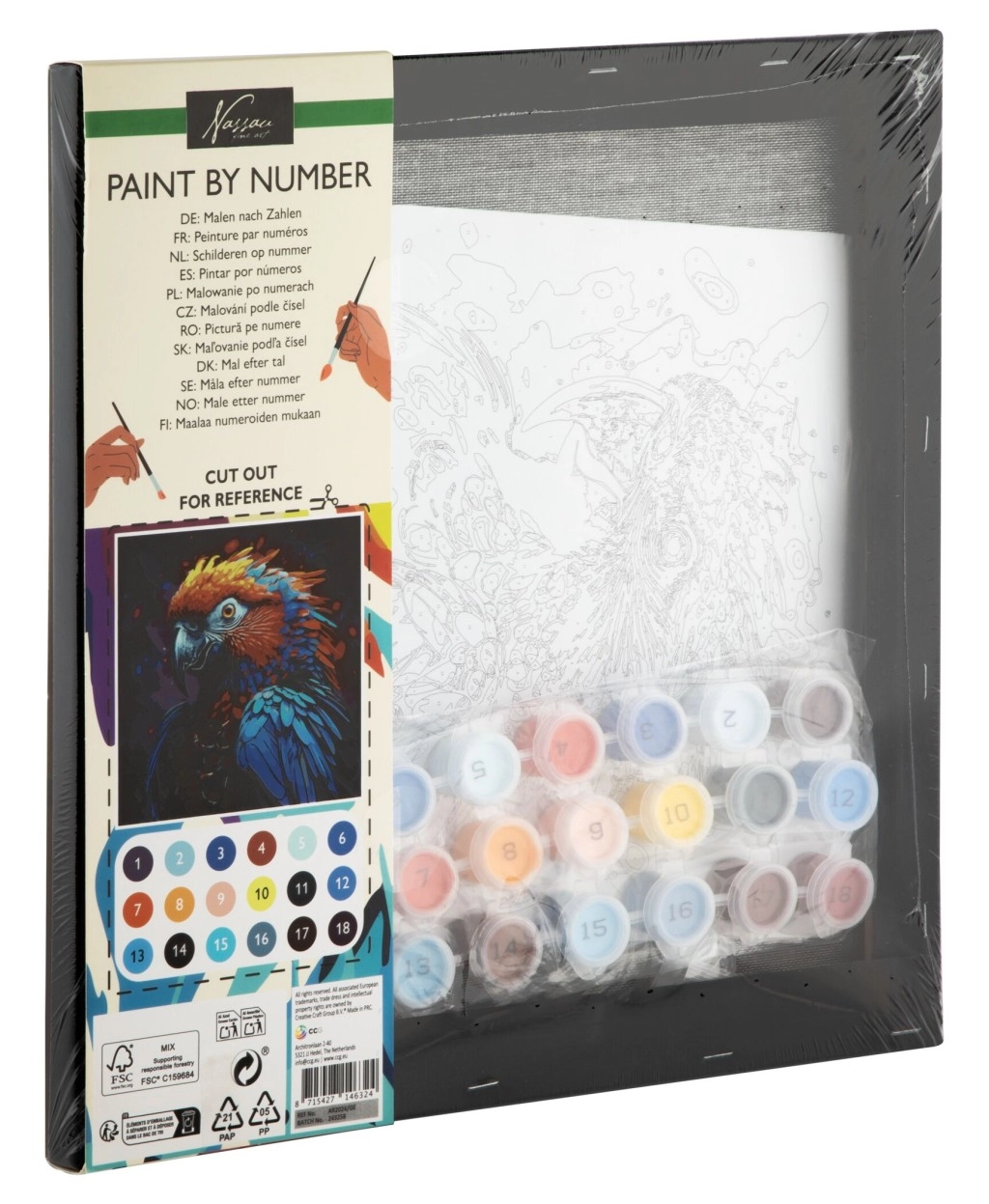 Crea la tua opera d’arte con il set creativo di dipinto per numeri su tela nera con motivo del pappagallo. Seguendo i numeri colorerai facilmente le singole aree con tonalità precise di colori acrilici. Questa attività rilassante sviluppa pazienza, precisione e senso del dettaglio, e il risultato finale sembra un vero quadro da atelier.