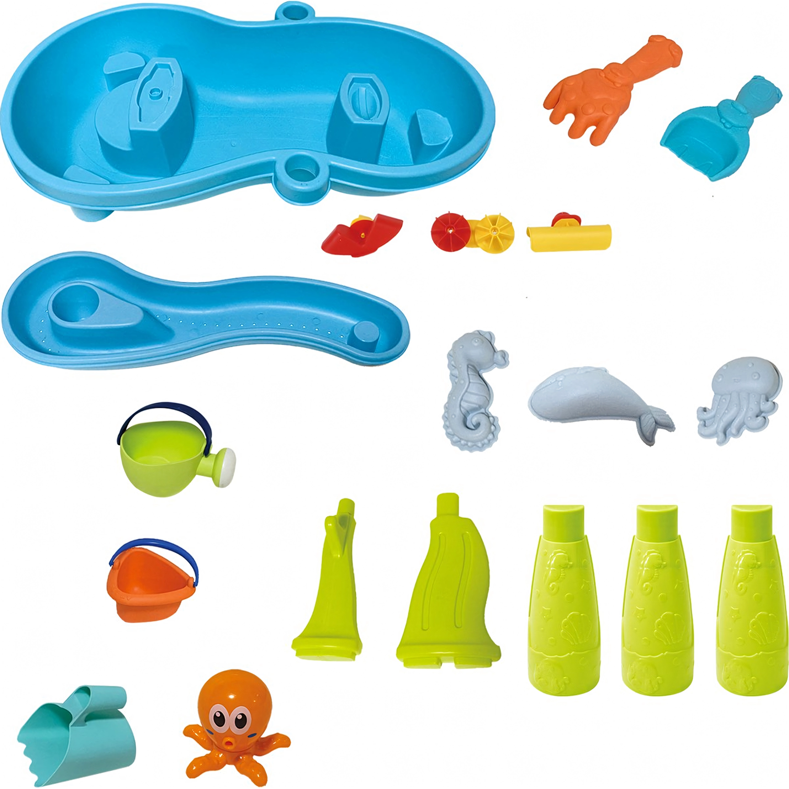Il set comprende numerosi accessori: palette, secchielli, annaffiatoio, formine di animali marini, scivoli e troppopieni d’acqua. Grazie alle diverse aree di gioco e agli ingegnosi canalini, l’attività è varia, favorisce la collaborazione tra i bambini e sviluppa la loro immaginazione.