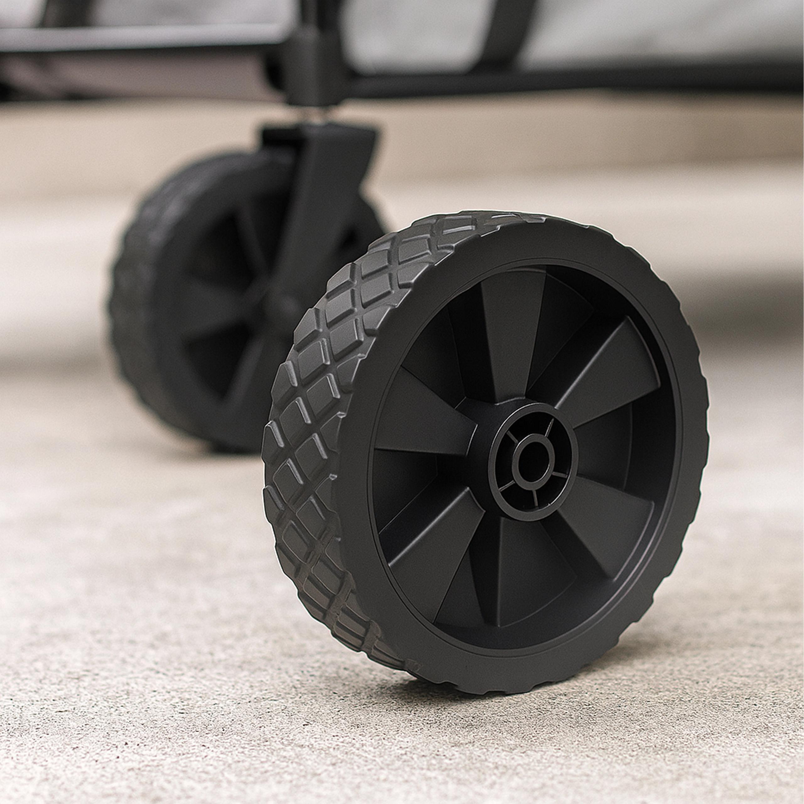 Il disegno diamantato grossolano garantisce stabilità e rotolamento fluido anche su superfici più ruvide, ideale per giardino e cortile.