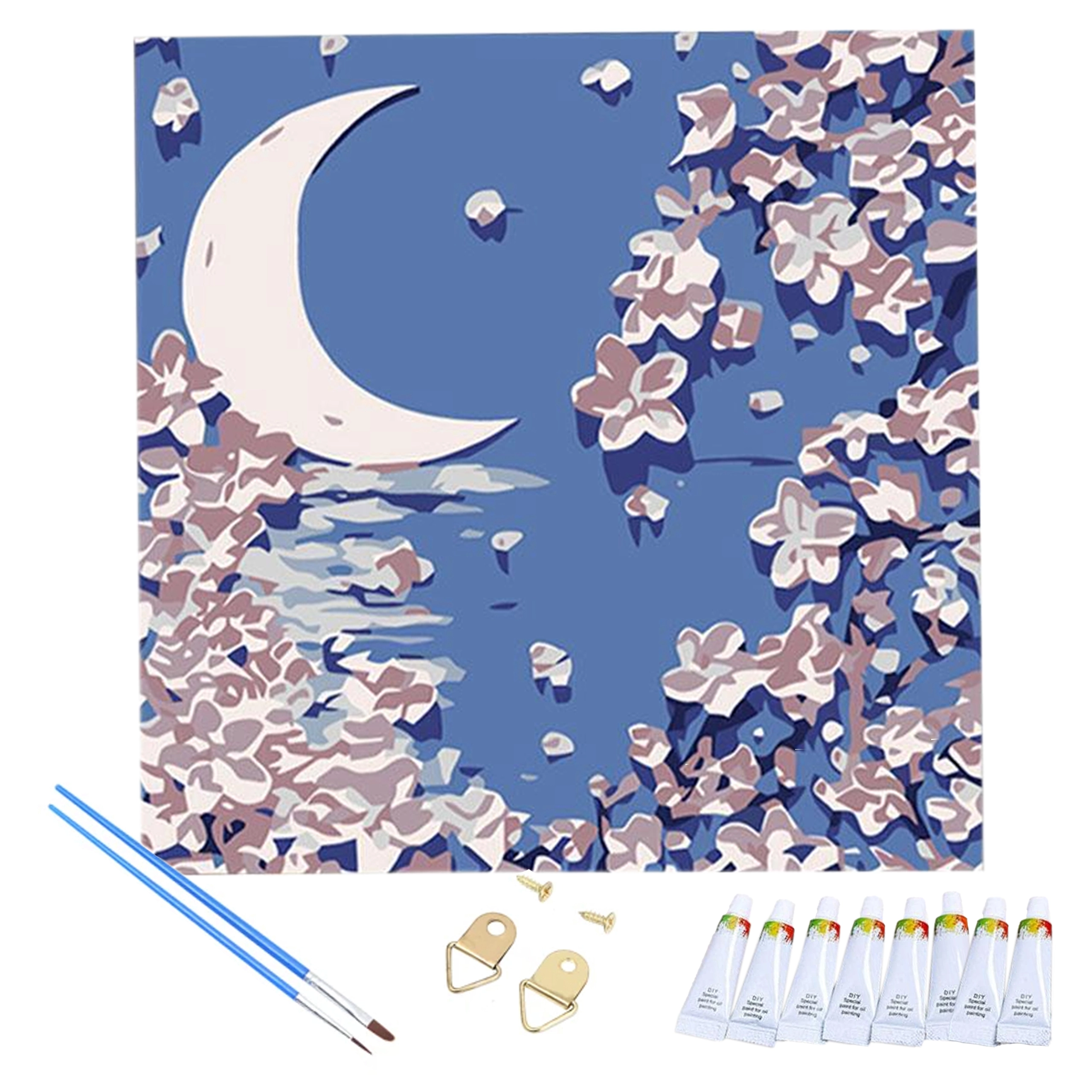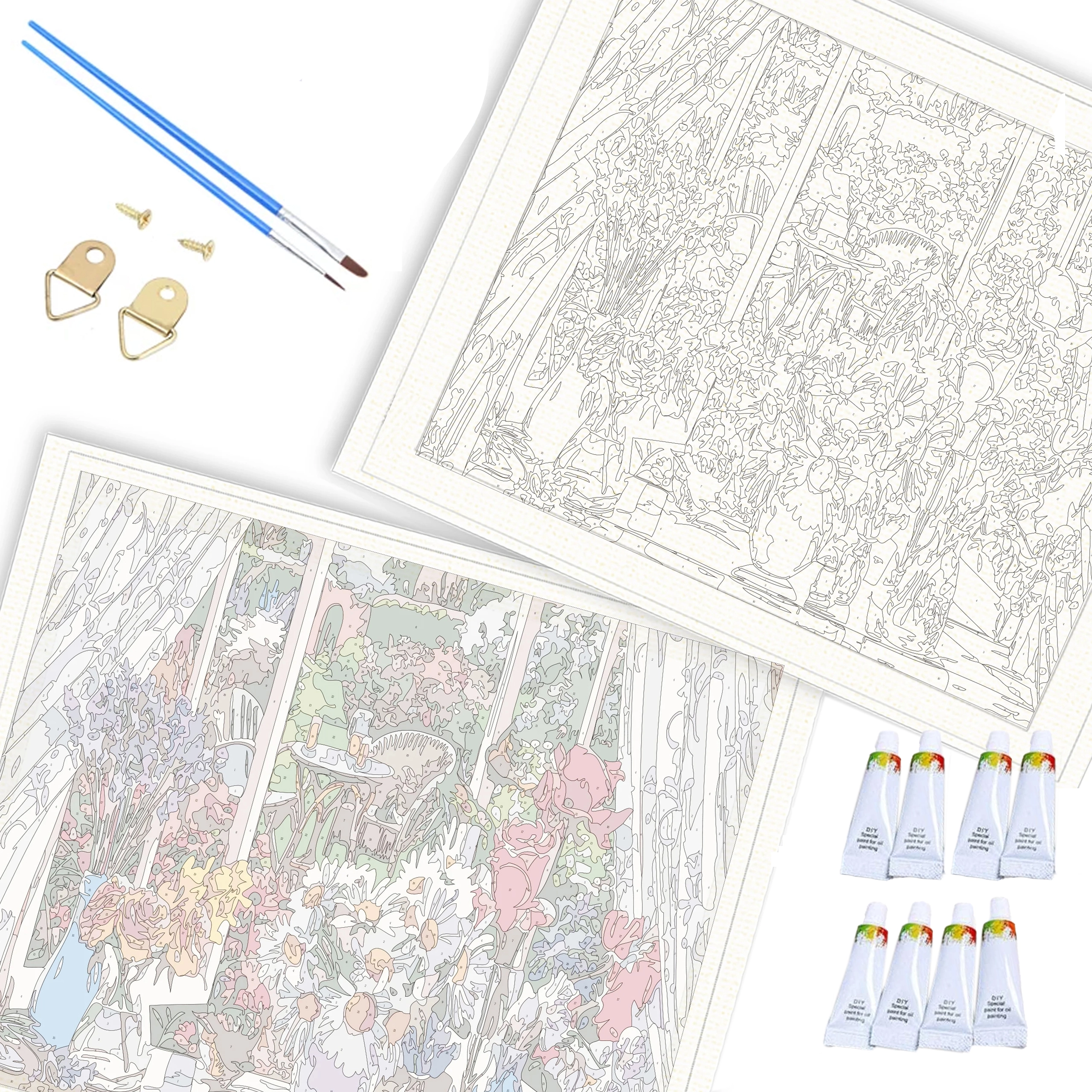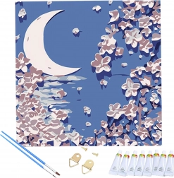 Set completo con tela numerata, colori acrilici, pennelli e accessori per l’appensione. Inizia a creare subito dopo l’apertura.