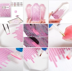 Il vassoio scanalato allinea gli strass in fila, così la penna li raccoglie facilmente e li posiziona sul punto giusto della tela.