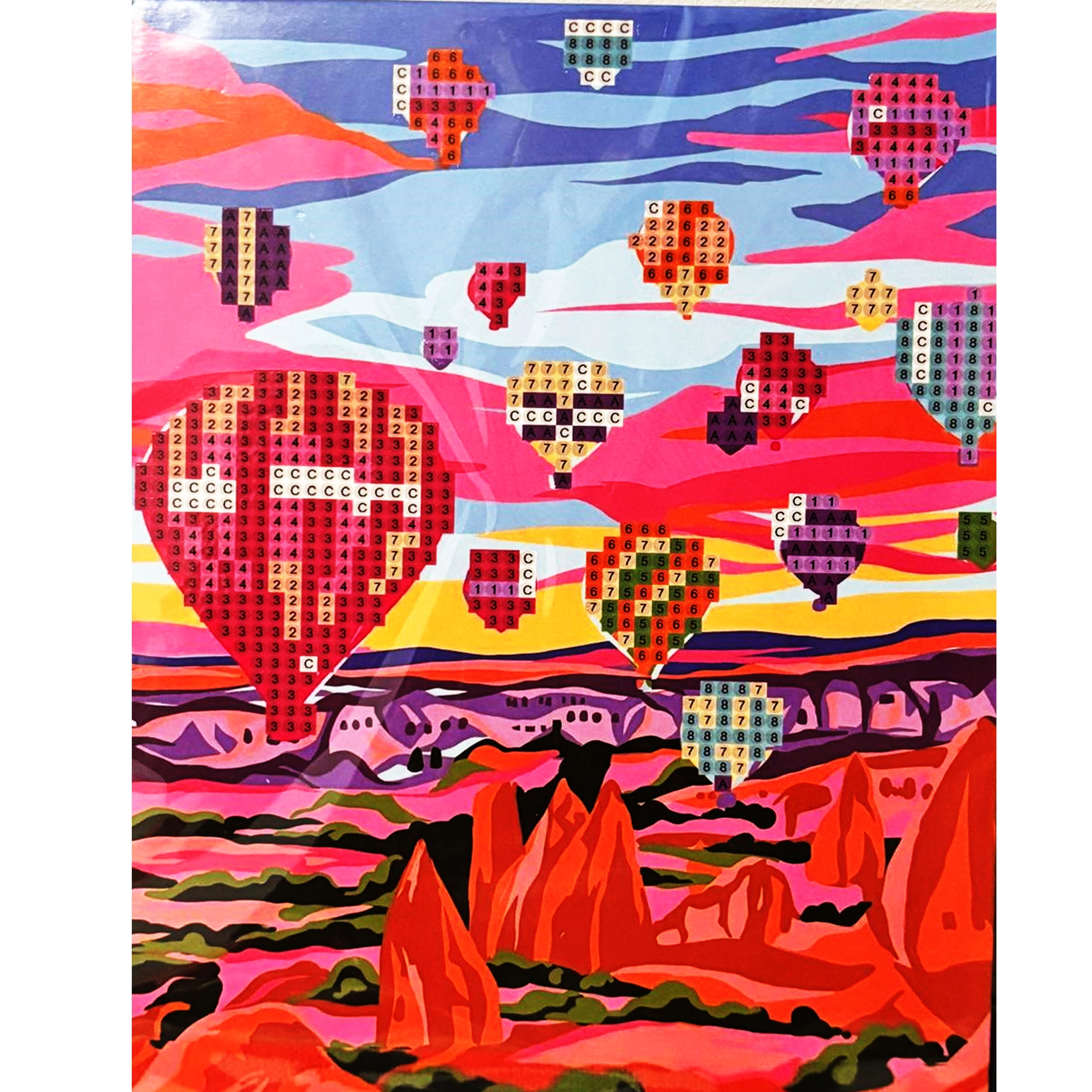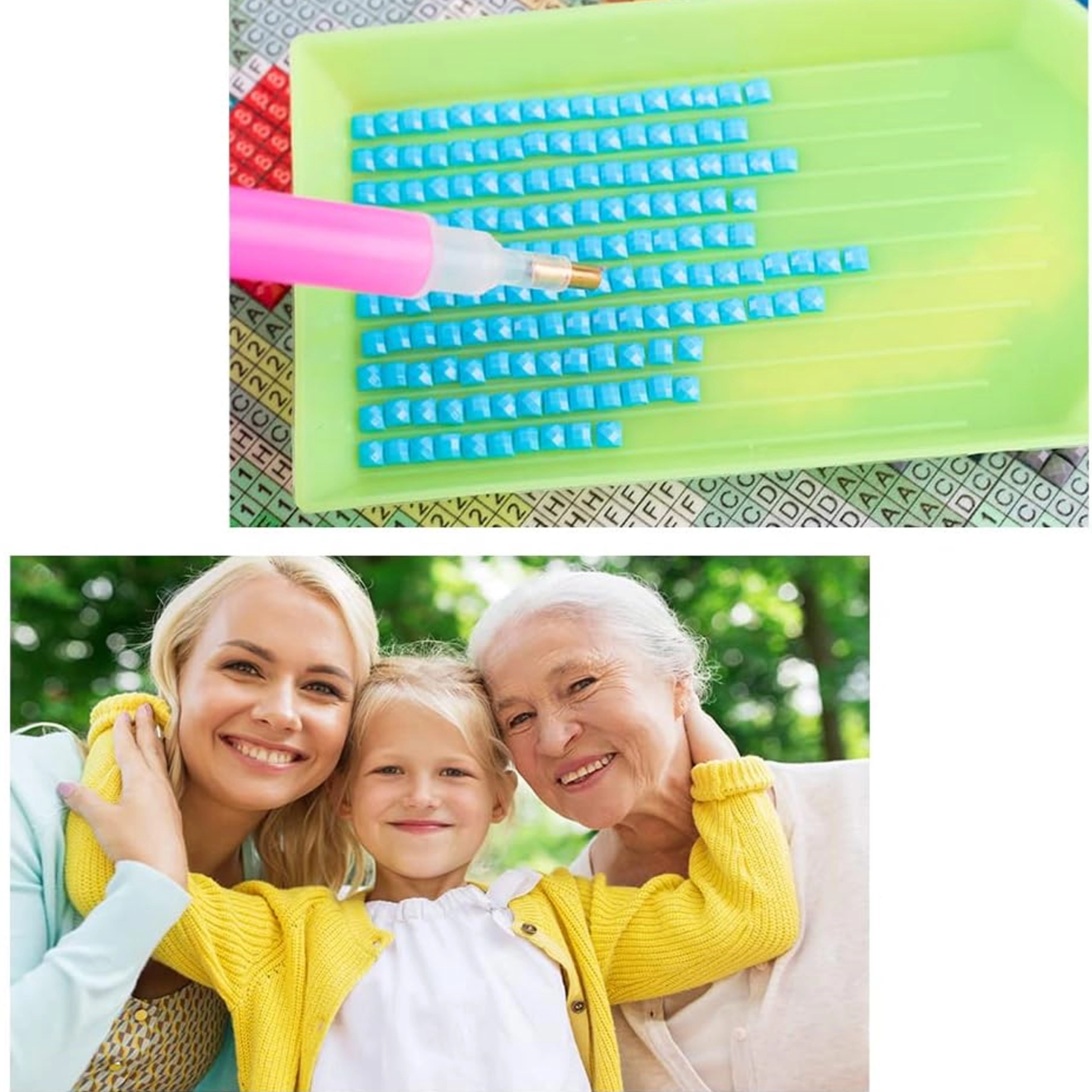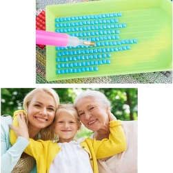 Il procedimento è semplice: versa le gemme nel vassoietto scanalato, prelevale con l’applicatore con cera e incollale sulla tela prestampata seguendo il codice. Grazie alla marcatura chiara, il progetto è ideale per bambini e principianti assoluti.