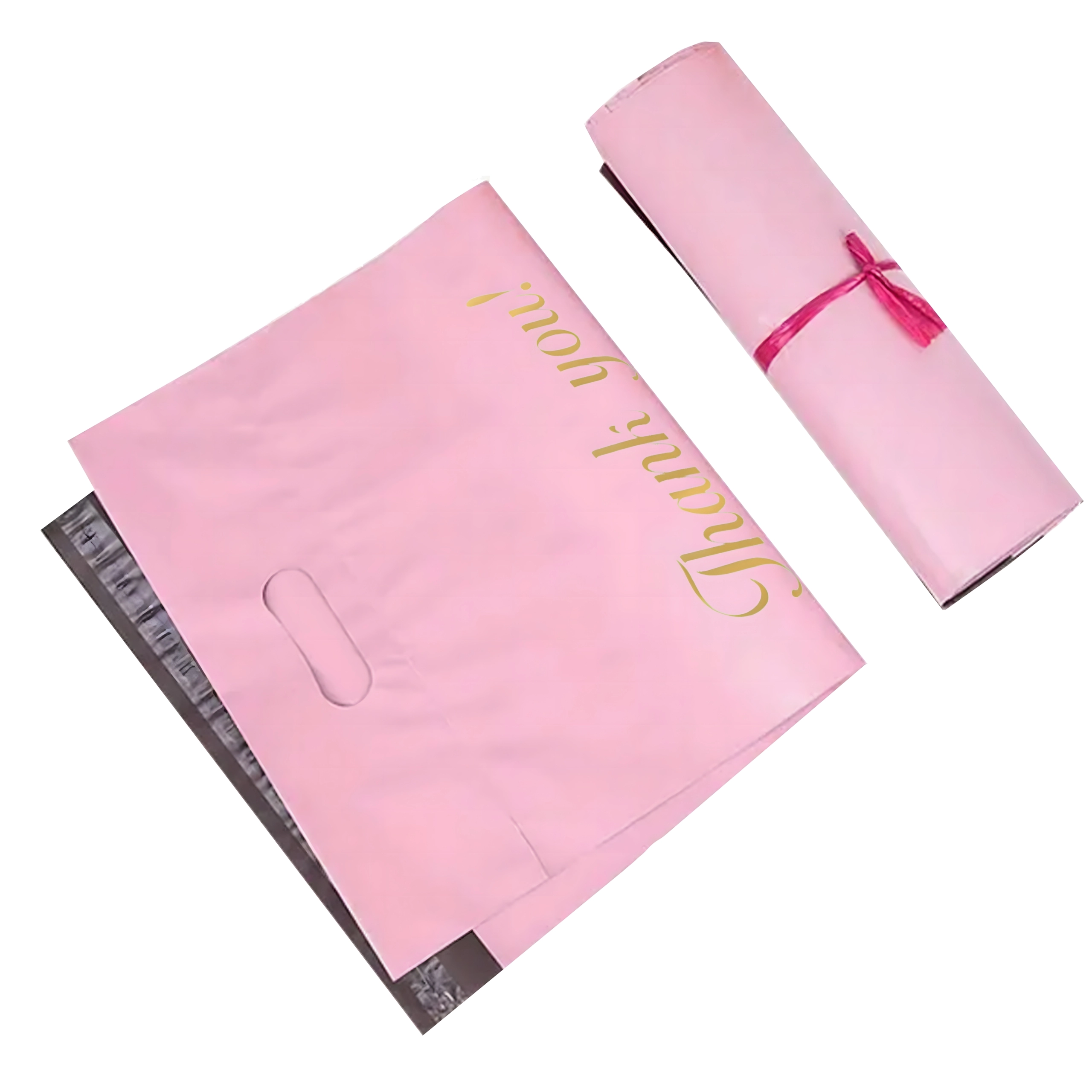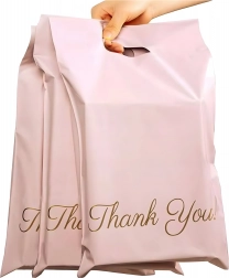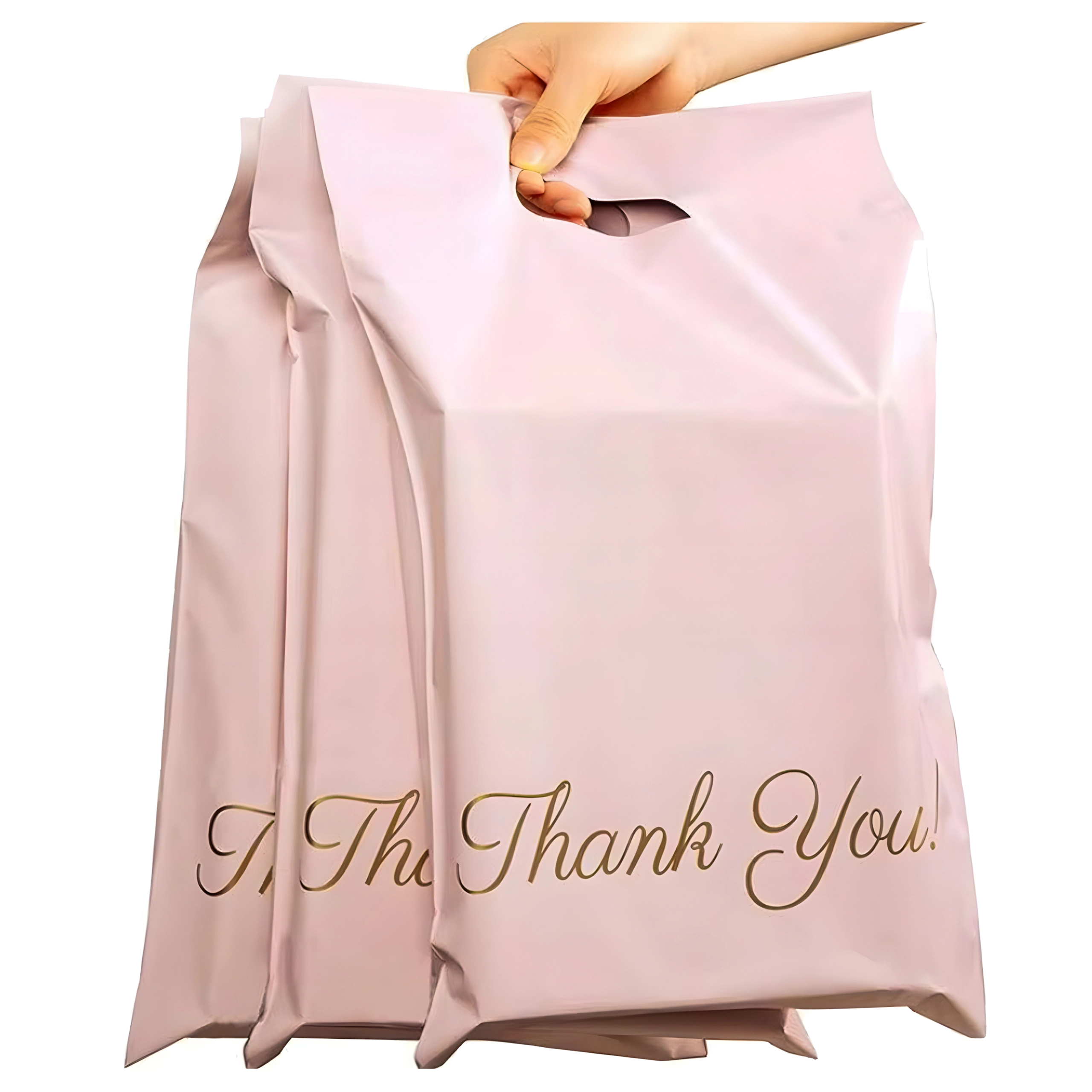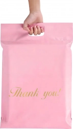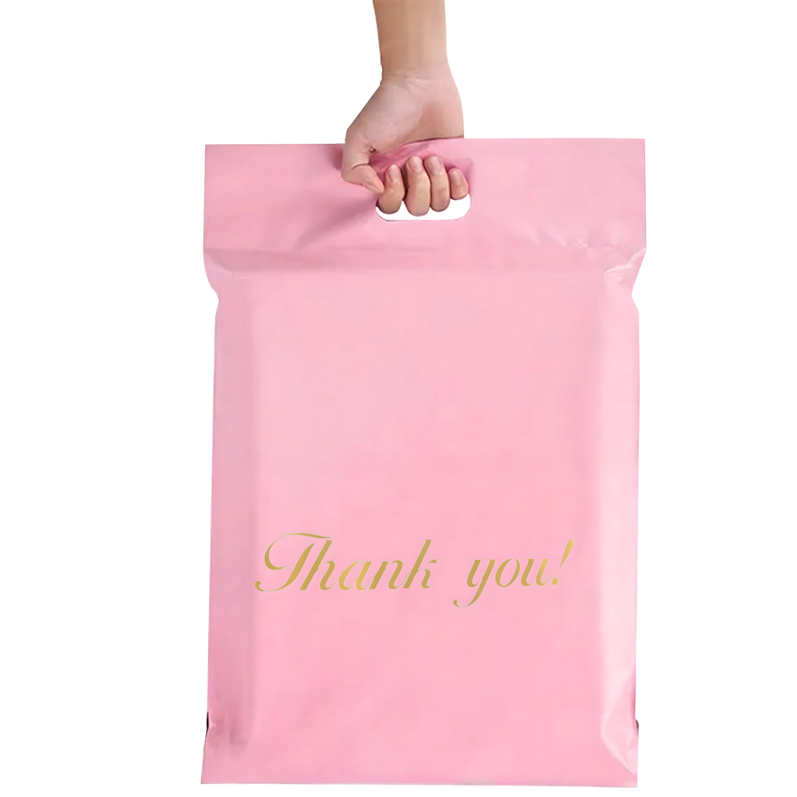 Pratiche buste poly rosa con manico fustellato per un trasporto agevole garantiscono un confezionamento sicuro, impermeabile e rapido delle spedizioni. Nastro autoadesivo per una chiusura affidabile, resistenza allo strappo e scritta elegante “Thank you!” per una presentazione stilosa del pacco.