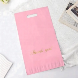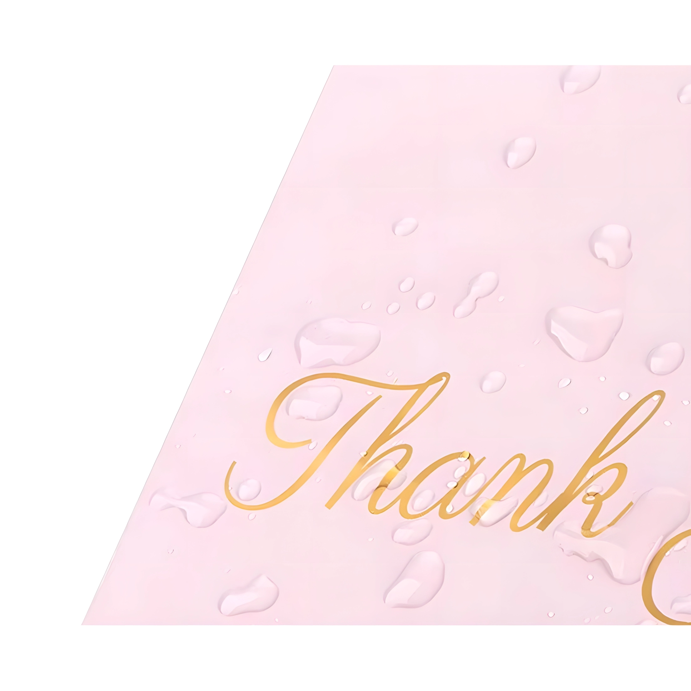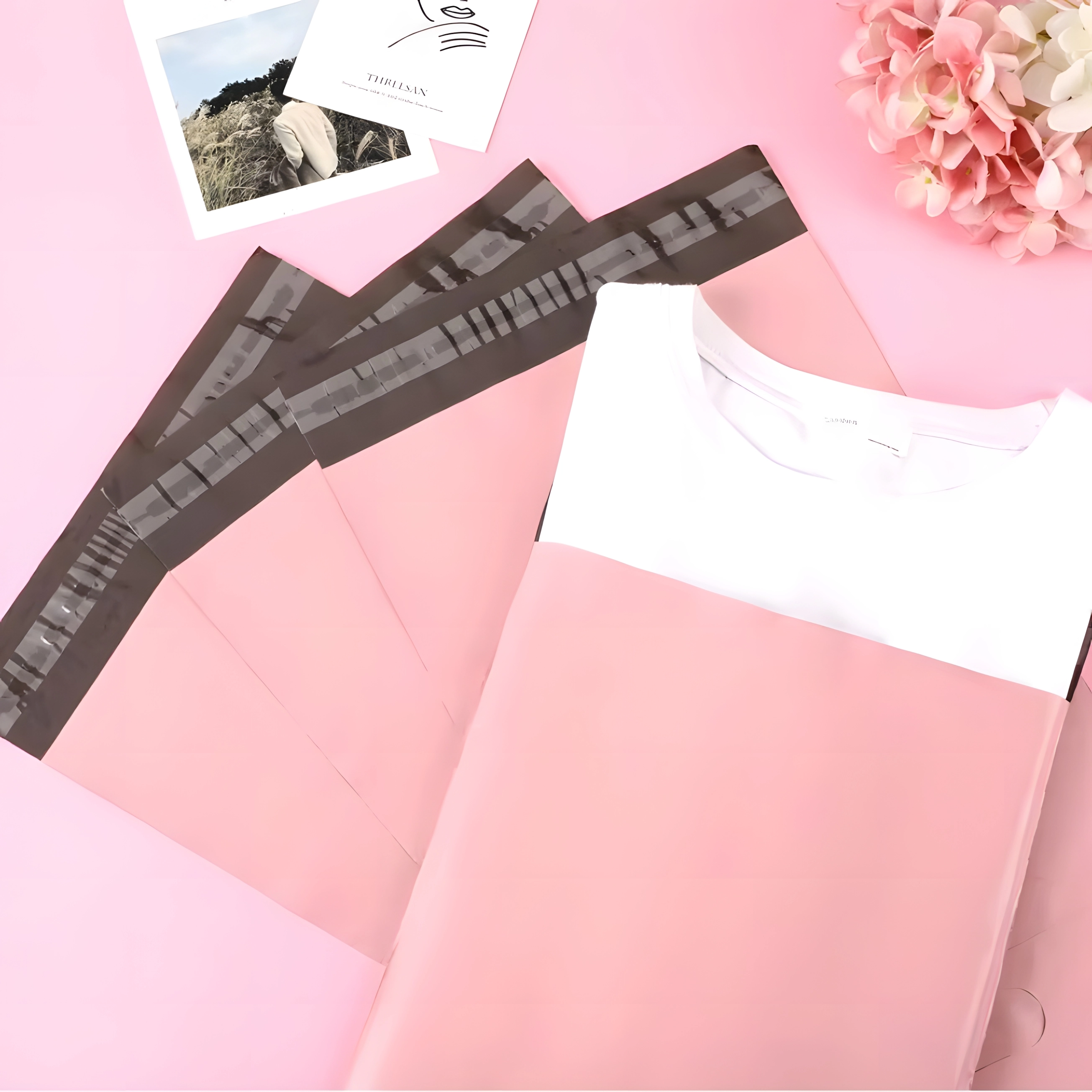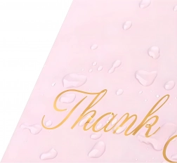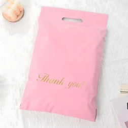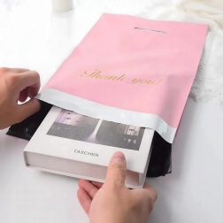 Pratiche buste poly rosa con manico fustellato per un trasporto agevole garantiscono un confezionamento sicuro, impermeabile e rapido delle spedizioni. Nastro autoadesivo per una chiusura affidabile, resistenza allo strappo e scritta elegante “Thank you!” per una presentazione stilosa del pacco.