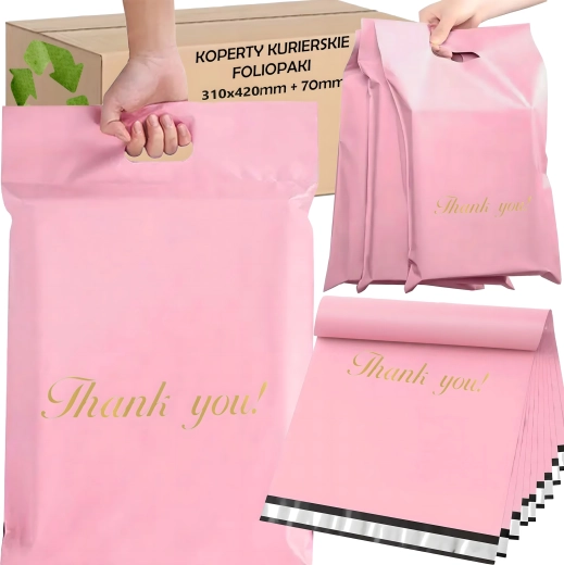 Resistenti buste postali in LDPE con manico, ideali per spedizioni e‑commerce e confezioni regalo. Il nastro autoadesivo garantisce una chiusura tamper‑evident, mentre il materiale impermeabile protegge il contenuto da umidità, polvere e sporco. La finitura rosa con la scritta “Thank you!” dona alle vostre spedizioni un aspetto professionale e accogliente.