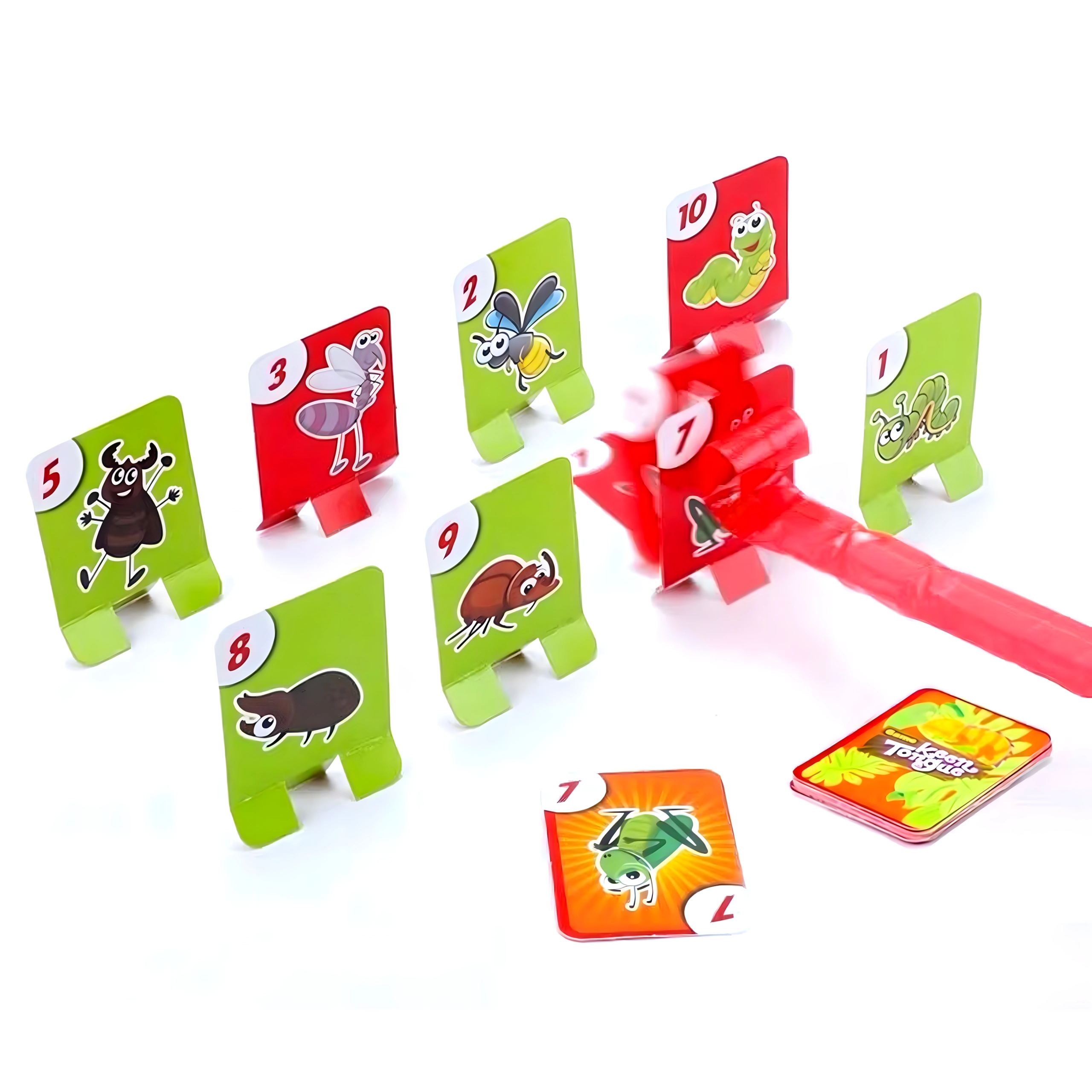 Il set include carte illustrate con numeri e insetti per diverse modalità di gioco – dalla cattura veloce all’abbinamento e al conteggio dei punti.