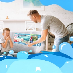 Il riempimento automatico rapido e l'affidabile azionamento elettrico semplificano l'uso, così i bambini possono concentrarsi solo sul divertimento. La lunga portata del getto fino a 10 m rende ogni gioco una coinvolgente battaglia d'acqua.